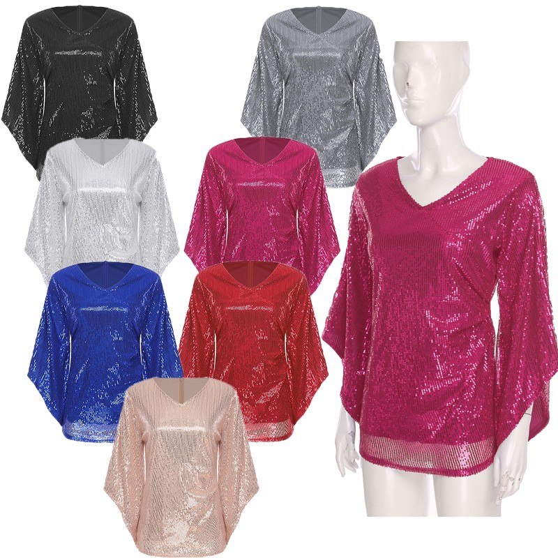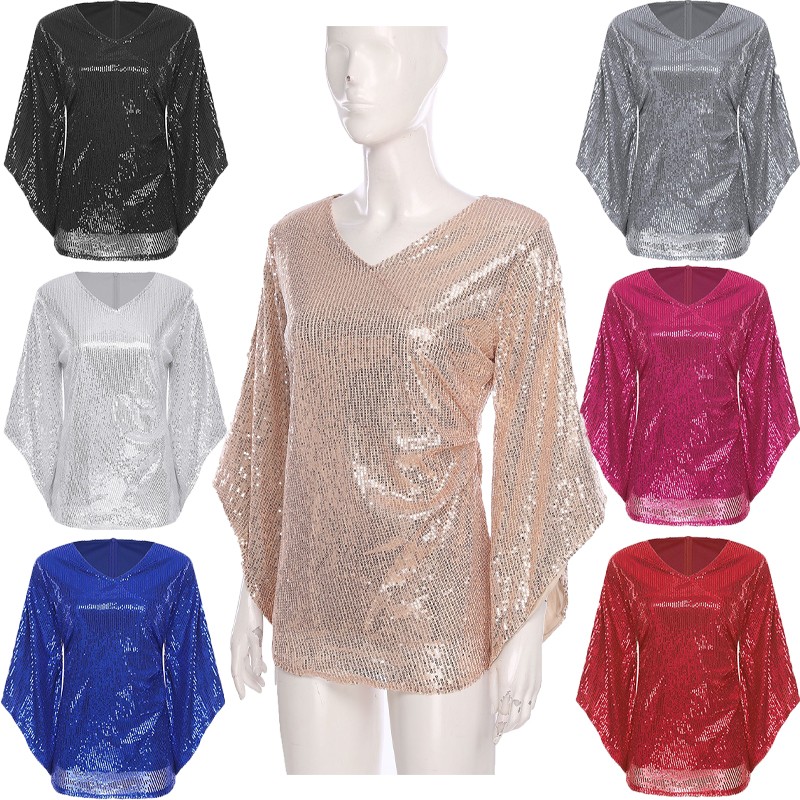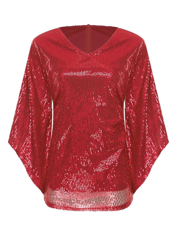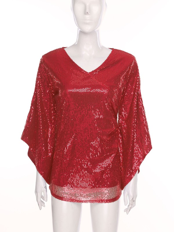 Made from a blend of polyester, sequin, and spandex, this blouse offers stretch and a comfortable fit, while the sequins add a touch of sparkle.
