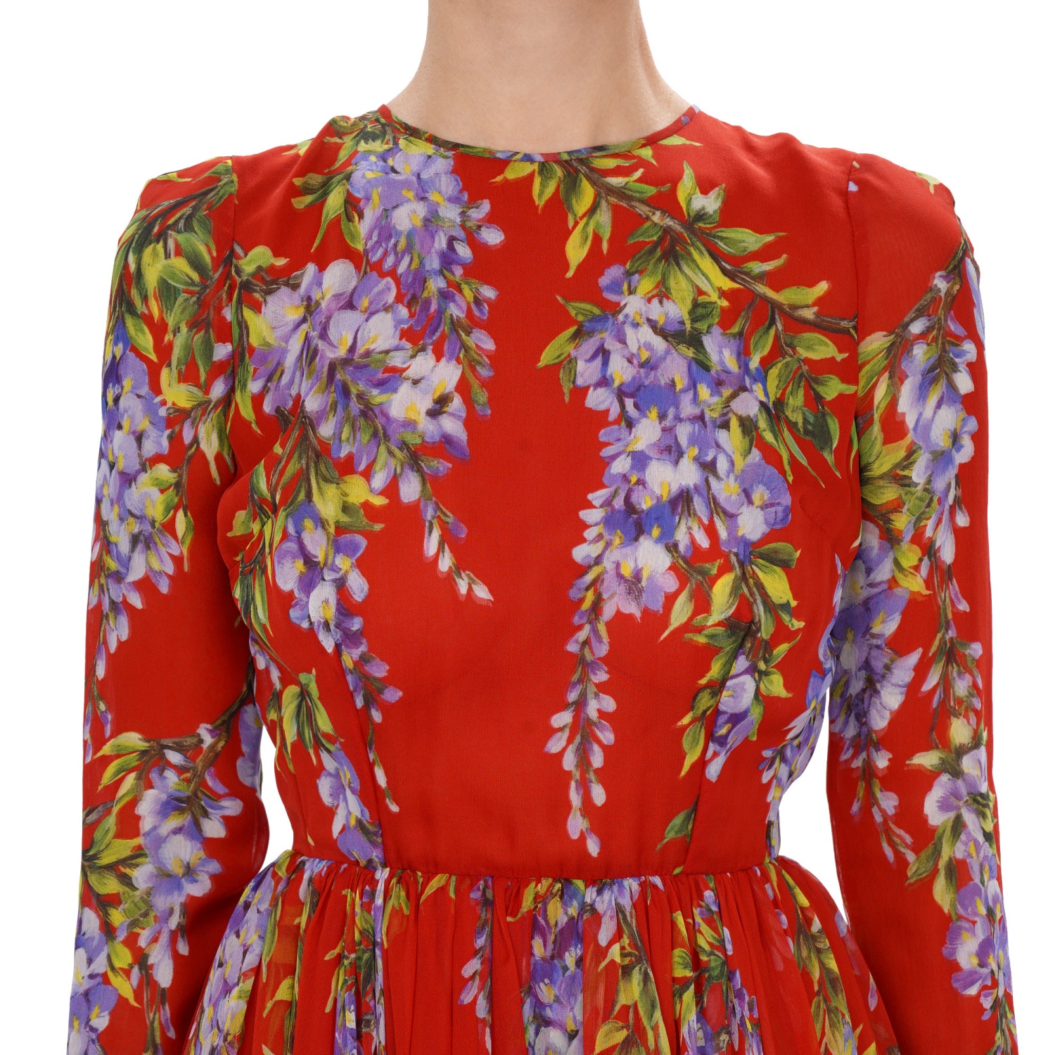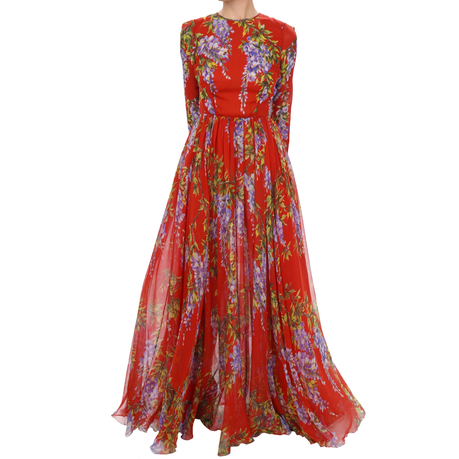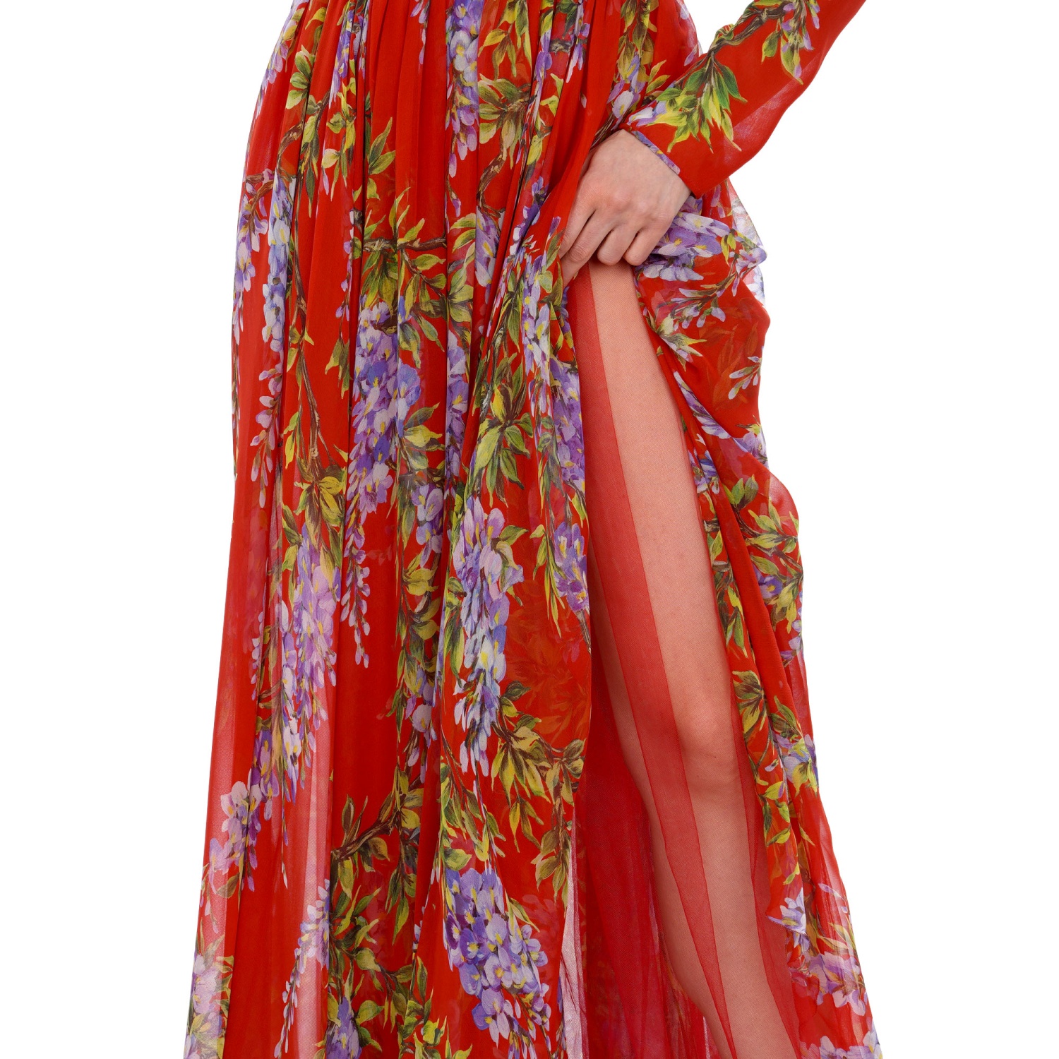 - Wisteria flower print maxi silk dress with open back and tulle underskirt in red and purple by DOLCE & GABBANA