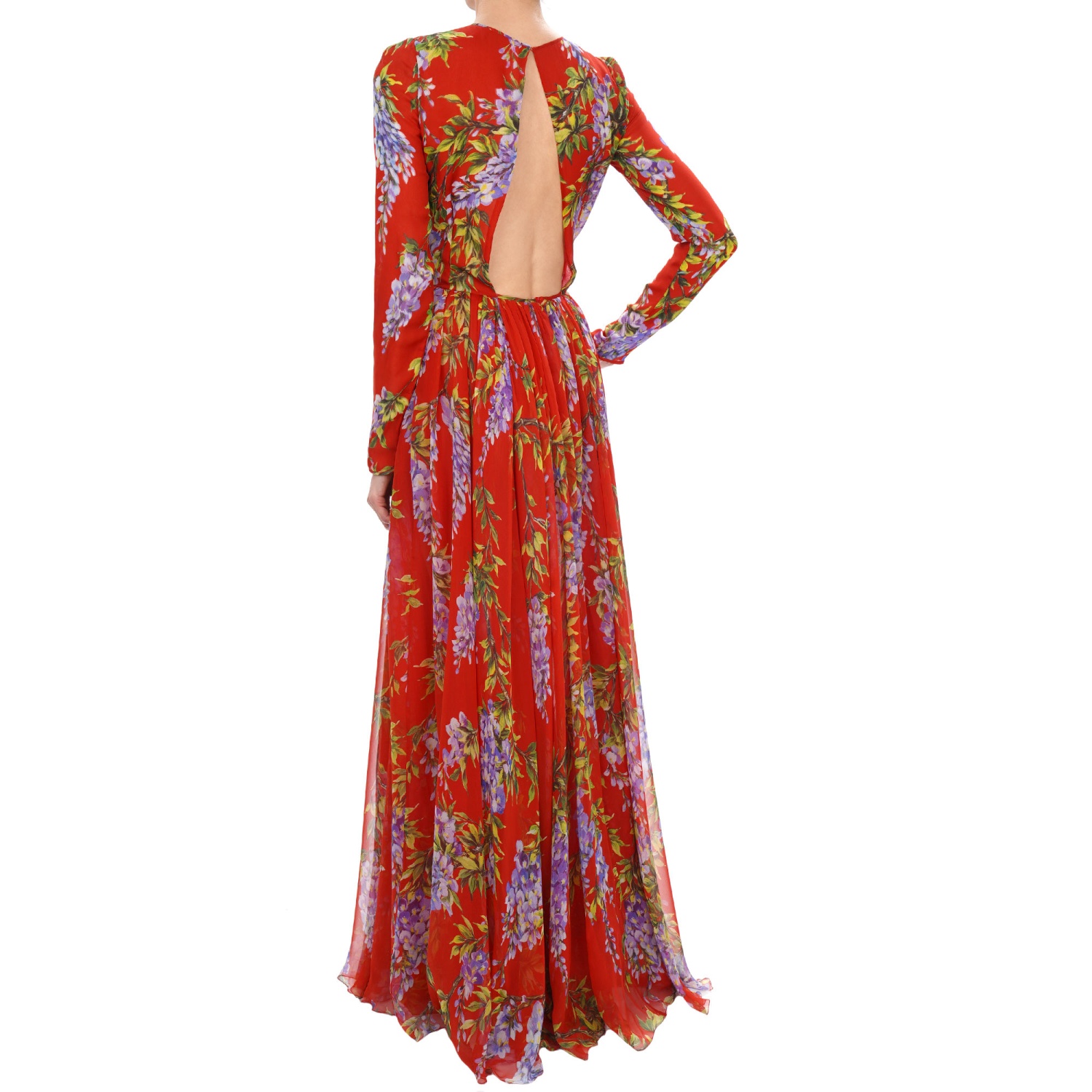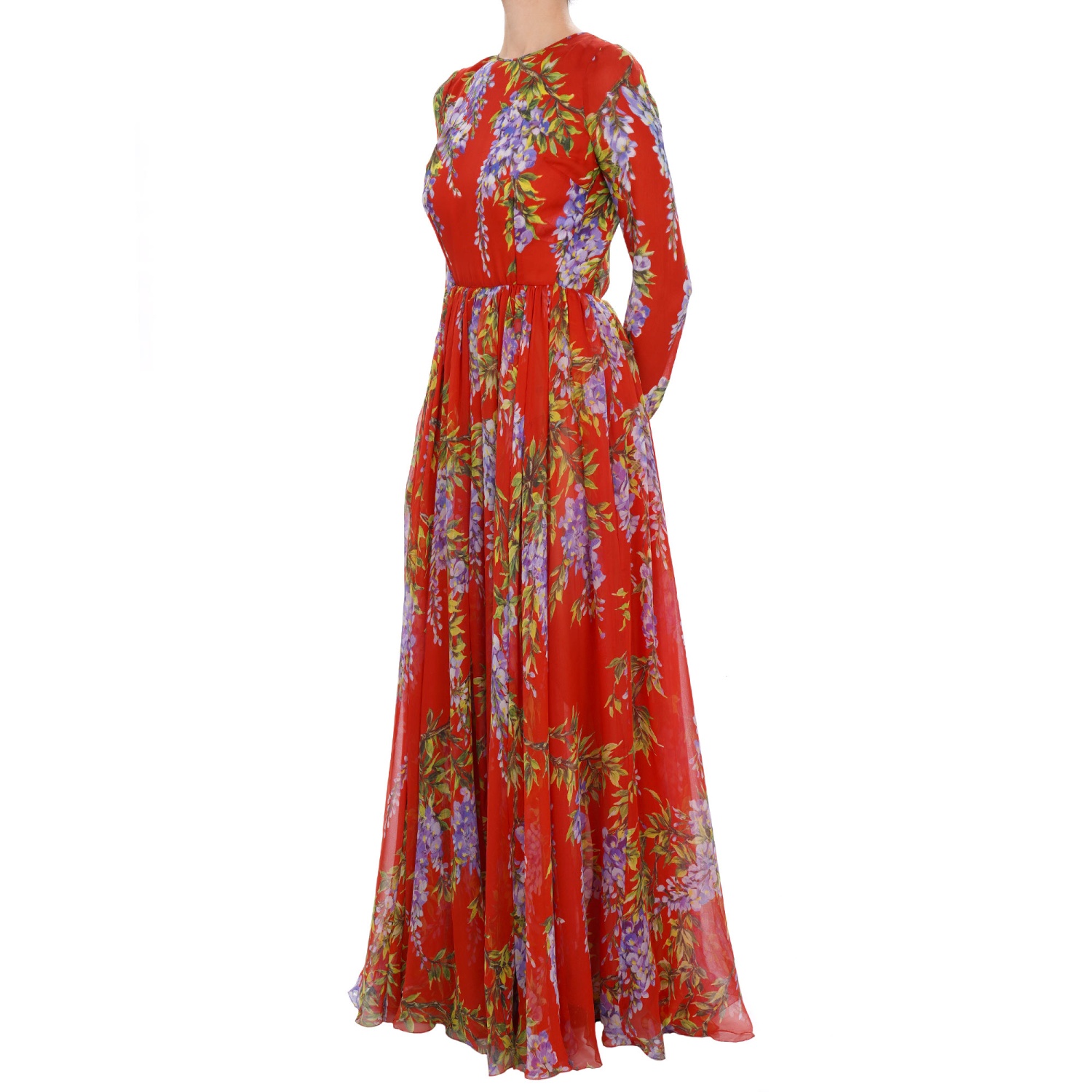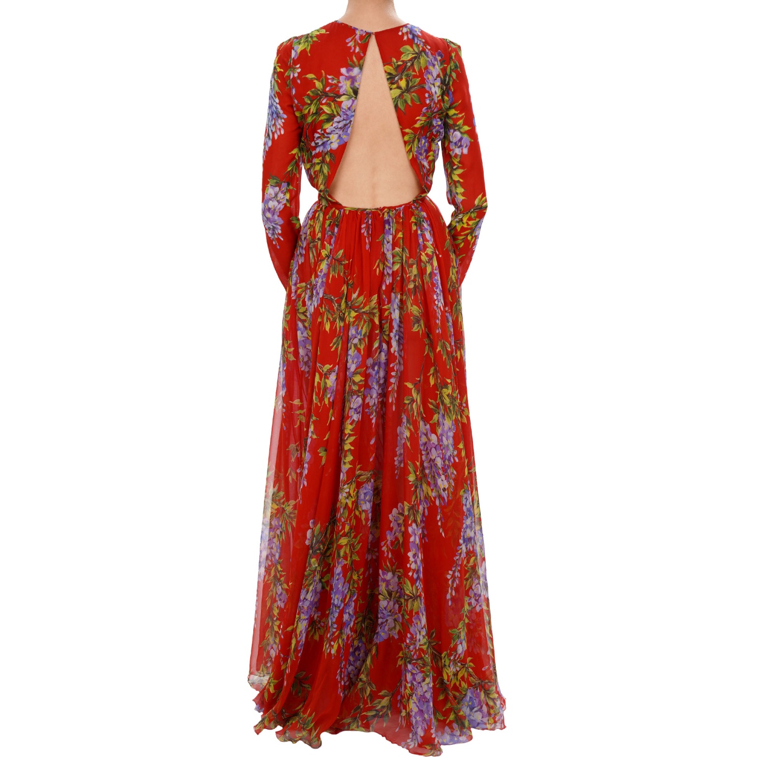 - Wisteria flower print maxi silk dress with open back and tulle underskirt in red and purple by DOLCE & GABBANA