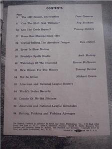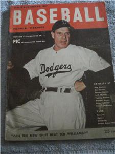 Up for auction is a VINTAGE 1947 STREET & SMITH'S BASEBALL PICTORIAL YEAR BOOK (LEO DUROCHER COVER) This auction is for a VINTAGE 1947 STREET & SMITH'S BASEBALL PICTORIAL YEARBOOK (LEO DUROCHER COVER). This 98-Page Year Book has both American and National League Schedules, World Series Facts & Figures and Rosters, with Plenty of Pictures. It also asks the Question "CAN THE NEW SHIFT BEAT TED WILLIAMS" It is in Very Good Condition for being 78 Years Old and will be shipped in a Plastic Sleeve with Cardboard Backing. A Hard To Find Item that would make a great addition to any Man Cave or Sports Collection. If you have any questions, please don't hesitate to ask.**PLEASE TAKE INTO CONSIDERATION, USPS HAS JUST RAISED THEIR RATES AGAIN.**