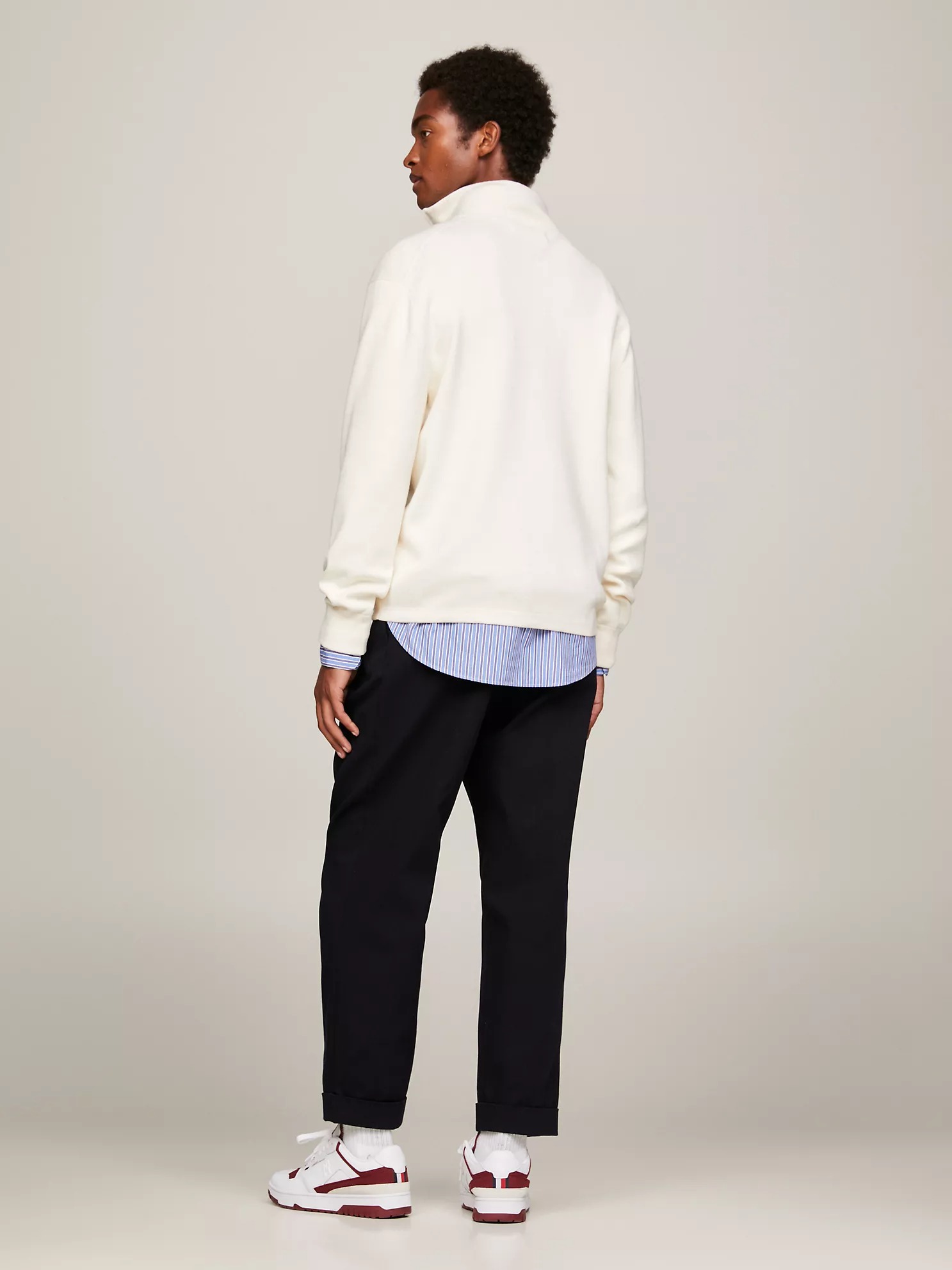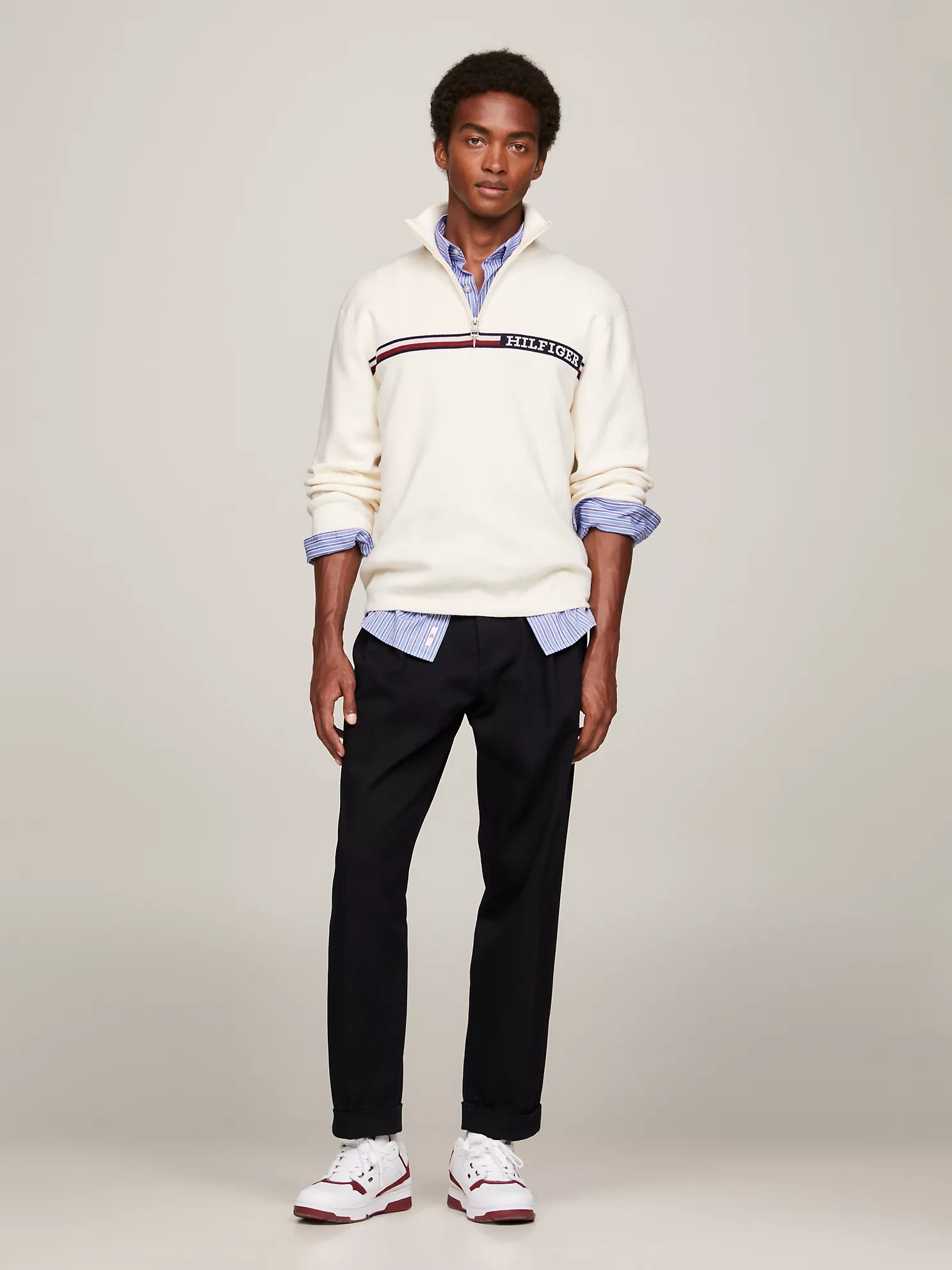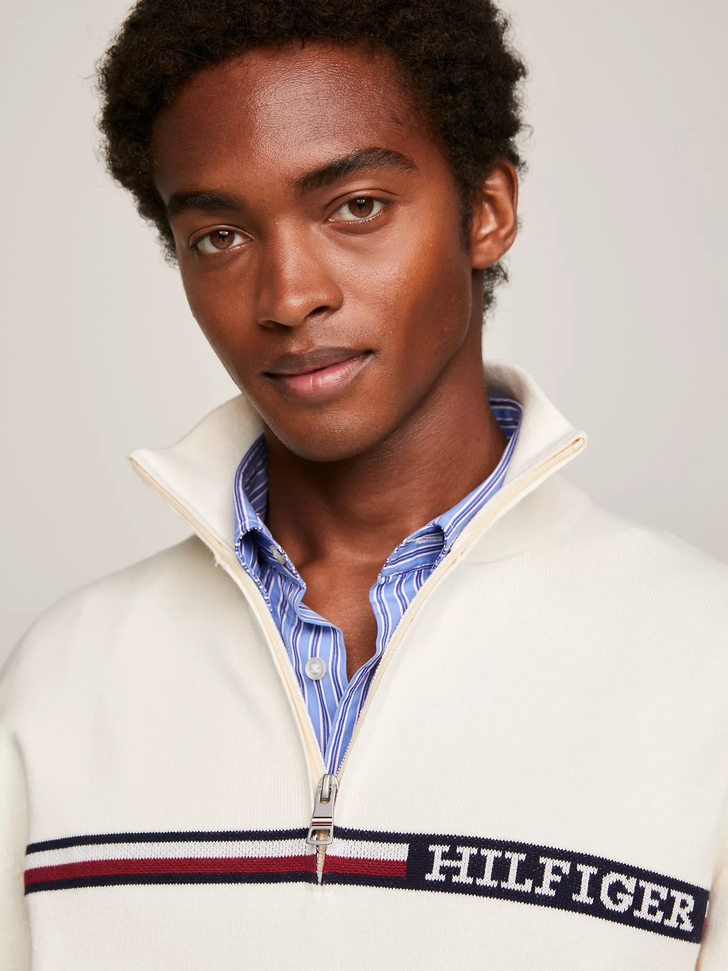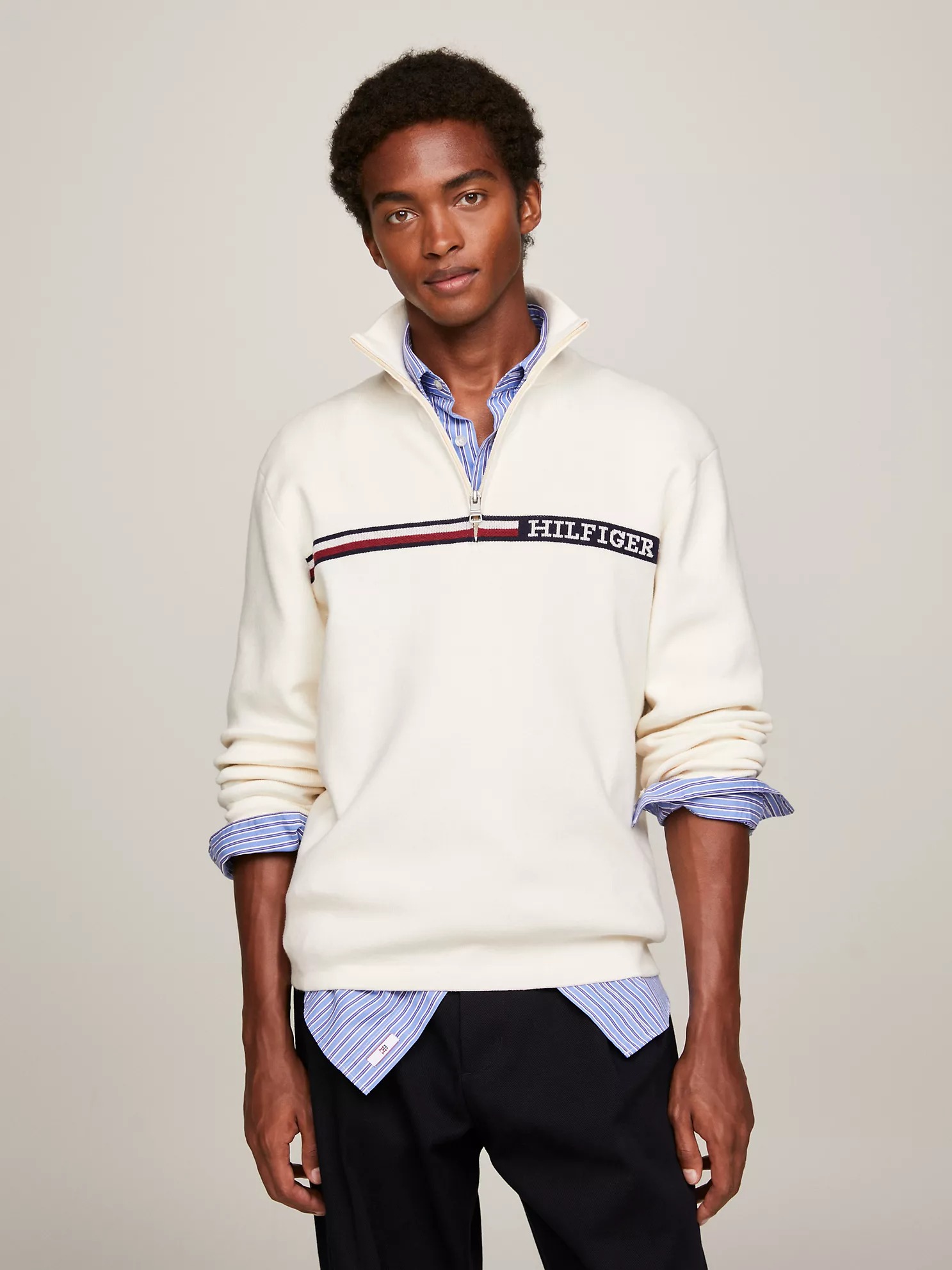 The Tommy Hilfiger sweater combines style and comfort effortlessly. Made with soft cotton, this quarter-zip sweater offers a relaxed fit that's both lightweight and warm. Featuring our signature monotype logo stripe across the chest, it's a versatile wardrobe staple that every man needs. Product Features Long sleeves Imported Zip-through collar; quarter-zip closure Signature monotype stripe Lightweight Relaxed fit Machine washable Cotton/polyester