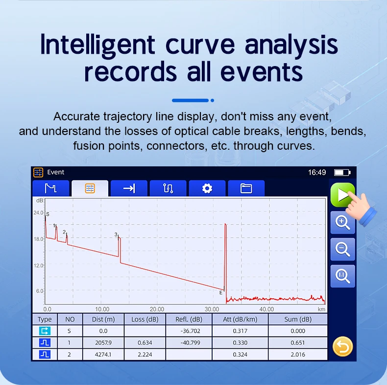 --- Intelligent curve analysis records all events . understand the losses of optical cable breaks , lengths , bends , fusion points , connectors , etc . through curves .