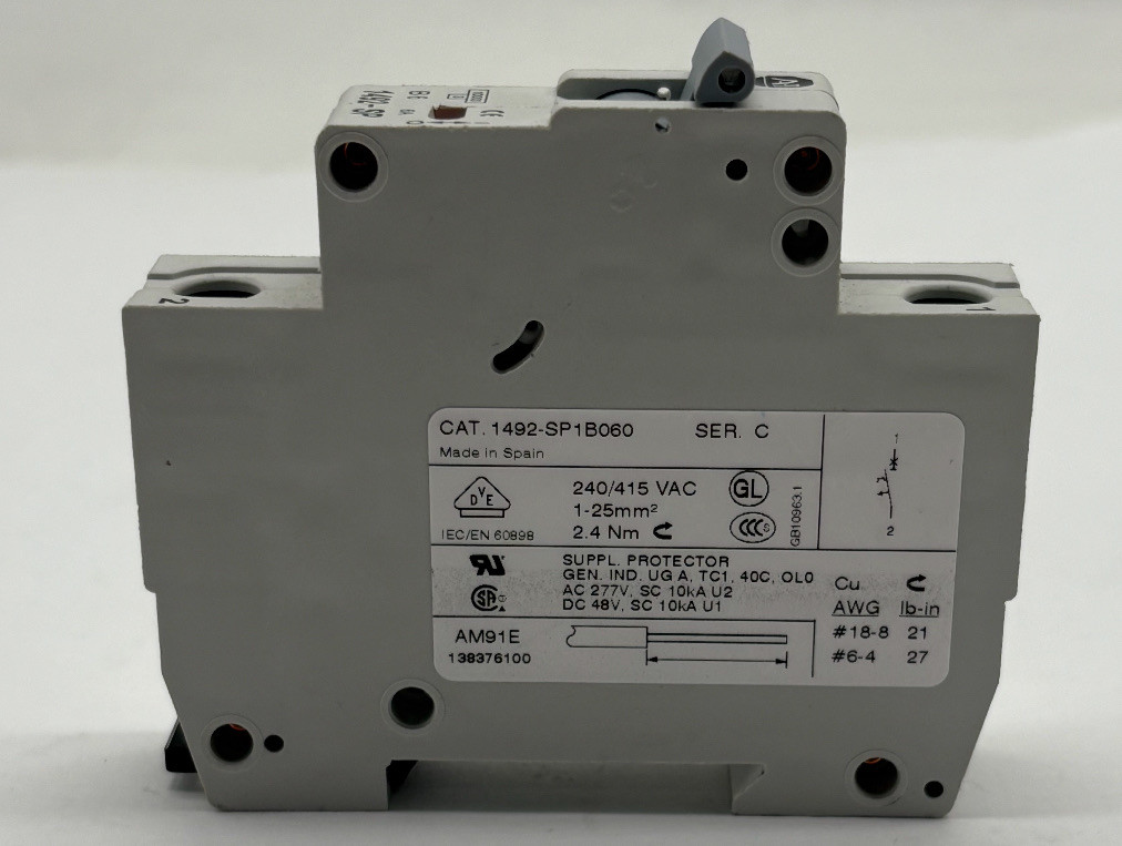Allen-Bradley 1492-SP1B060 SER. C is a single-pole miniature circuit breaker (MCB) designed for supplementary protection in industrial control systems.
