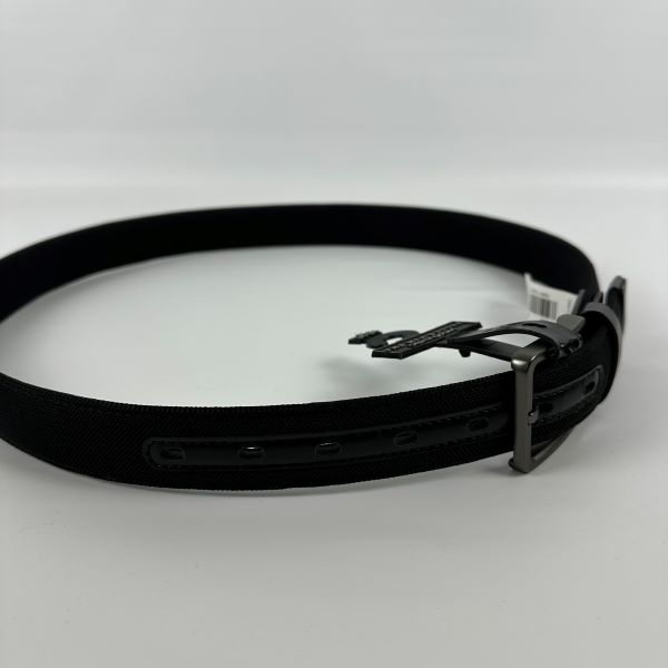 Approx. strap width: 1-3/8" Single-prong harness buckle Rectangular gunmetal-tone buckle For best fit, order a size 1" larger than your waist size Faux Leather Trim/Nylon Mesh Wipe clean Imported