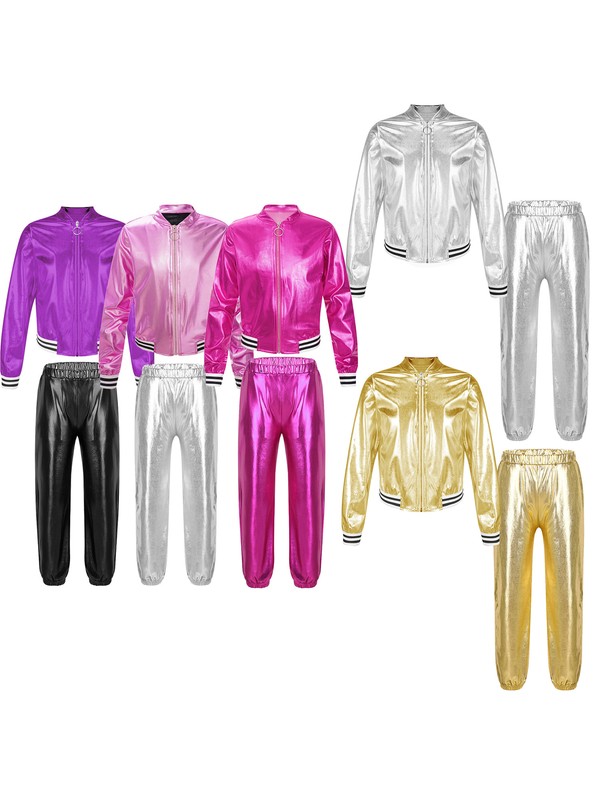 Set Include: 1 Pc Kids Girls Metallic Long Sleeve Stand Collar Zipper Jacket with High Waist Pants