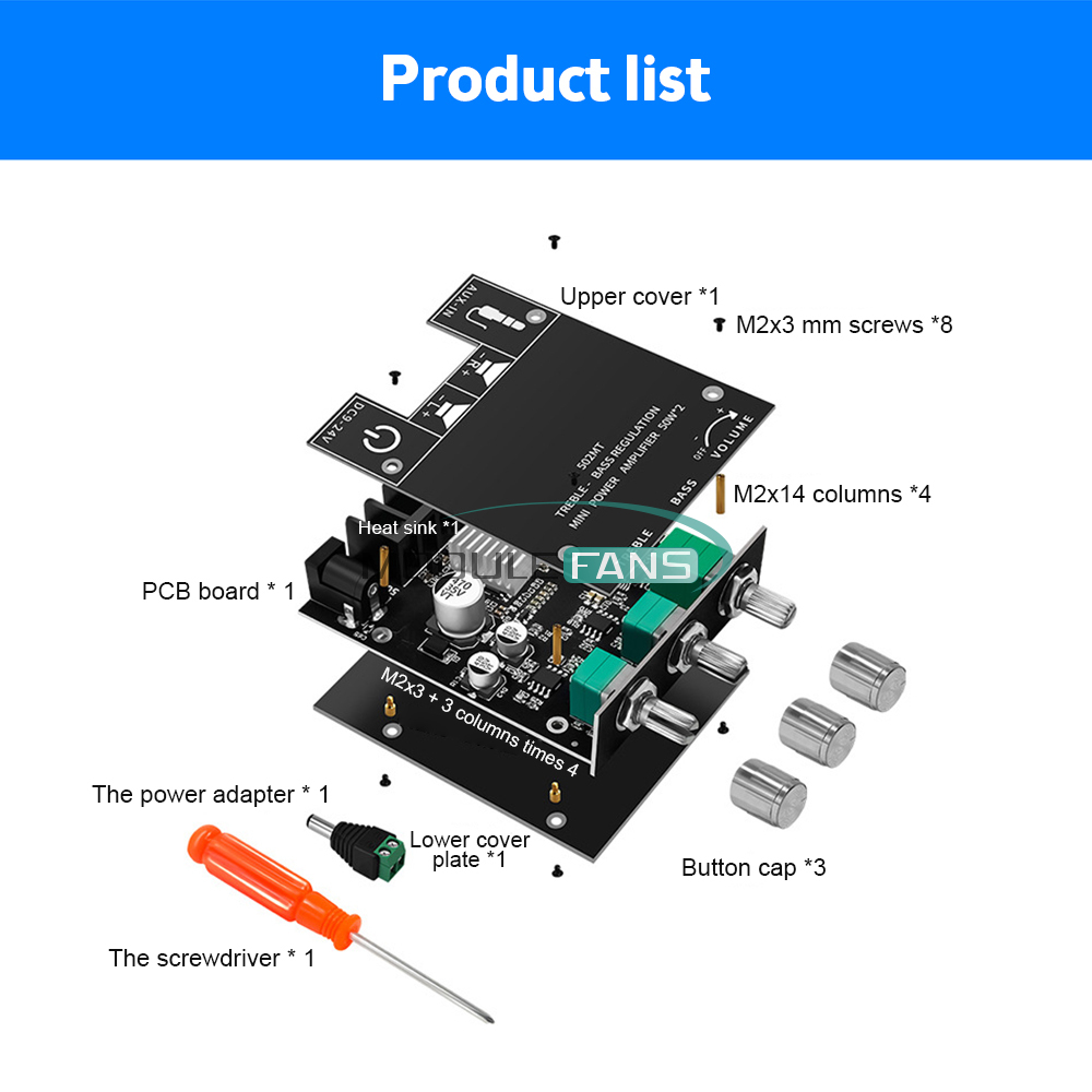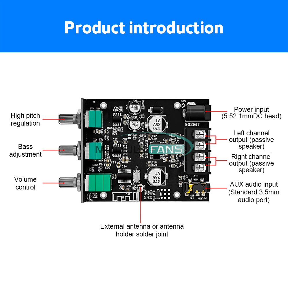 Recommend the use of 18V19V24V power supply, the current of more than 5A. If you only have 9V12V or 1A2A power supply, you can also use but the power is small, pay attention to the use of the volume to the maximum may be distorted, affecting the sound quality.