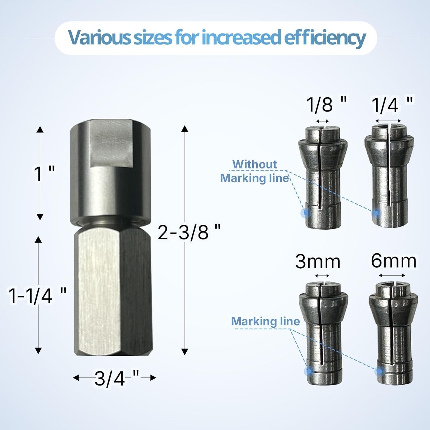 Widely Compatible: Equipped with 4 collets (1/8", 1/4", 3mm, 6mm), our angle grinder adapter accommodates a vast range of accessories, including flapper wheels, carbide burrs, cutoff wheels, and polishing wheels.