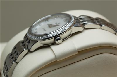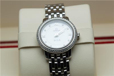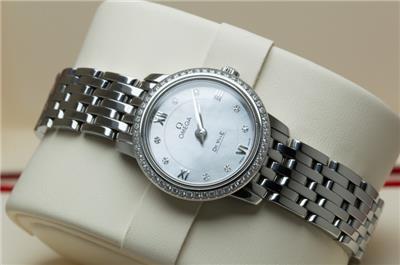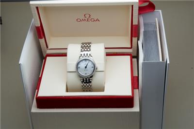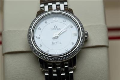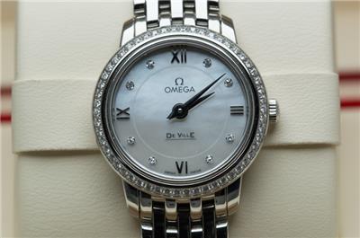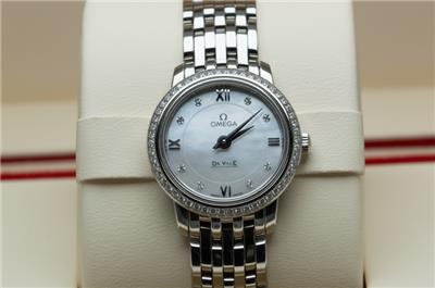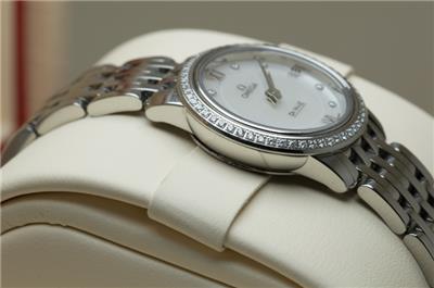 Here we have for sale a stunning genuine ladies Omega De Ville Prestige wristwatch that is ready to wear. The watch case is stainless steel with a stainless steel caseback which bears the serial number 91715217 and the Omega world logo. The watch comes fitted to a stainless steel Omega bracelet that will fit upto a 156mm wrist, with no spare links supplied (this is little small). The Stainless steel bracelet is reference 6003/752. There are a few light marks from daily wear to the case and bracelet. The watch can be adjusted using the Omega signed crown fitted and is running well, keeping excellent time, having a quartz Omega movement. The dial is in excellent condition and is finished in mother of pearl set with diamonds, with a diamond set bezel. The watch is supplied with outer box, inner box, Omega soft bag, manual and card holder, but no original papers. The Omega reference number is 424.15.24.60.55.001. The watch measures 24.4mm in diameter excluding crown.