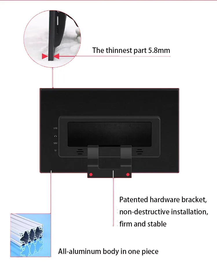 Specifiction: 1.13.3 inch G+G tempered glass 5 point touch screen. 2.Latest android 12.0, eight-core, Cortex-A55 high speed processor.RAM3G, ROM32G. 3.Multiple Choices for endless entertainment: Bluetooth-compatible,FM transmitter,digital tv box,phone mirroring , Google search , You Tube , play games...etc. 4.Support multiple languages: such as English, Chinese, Spanish, German, Russian,Portuguese, Arabic, Korean, Japanese, Dutch, Hindi, etc. 5.Ultra-thin design,as thin as 5.8 mm. 6. Adjustable Viewing Angles: easy and safe to install,without damage original car cable.The bracket can be adjusted up and down . 7.Two monitors are working independently. 8.Built-in 13 million pixel camera and microphone for video conference and video call. 9.Built-in 2.4G and 5.8G wifi module, making phone mirror-link smoother. 10.Support 4G internet ,stable signal transmission.