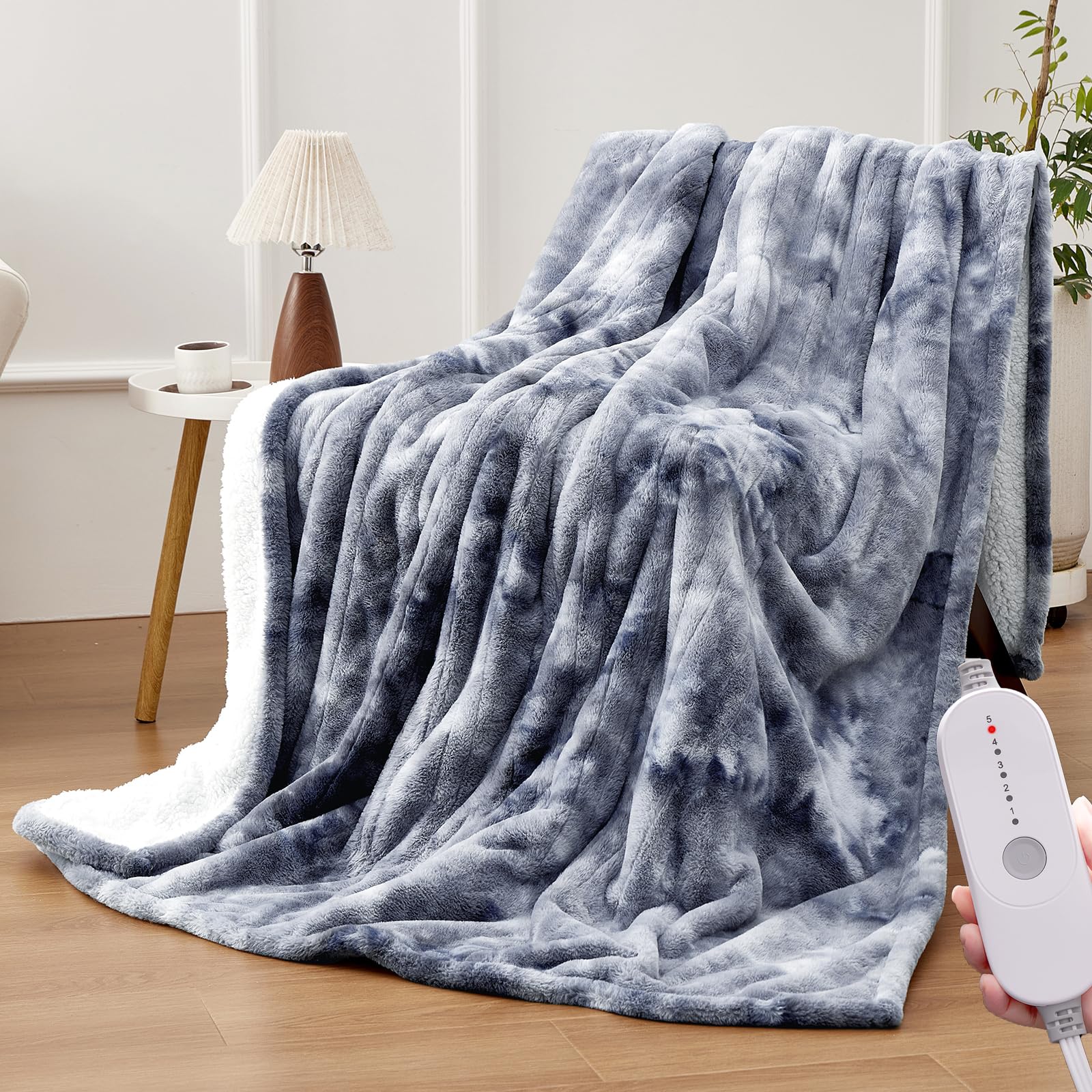 HYLEORY Heated Throw Blanket 50''x60'' - Soft Faux Fur Electric Blanket with 5 Heating Levels & Auto Off 3 Hrs, Fluffy Cozy Warm Flannel Couch Bed Blankets for Winter Halloween Decor, Grey