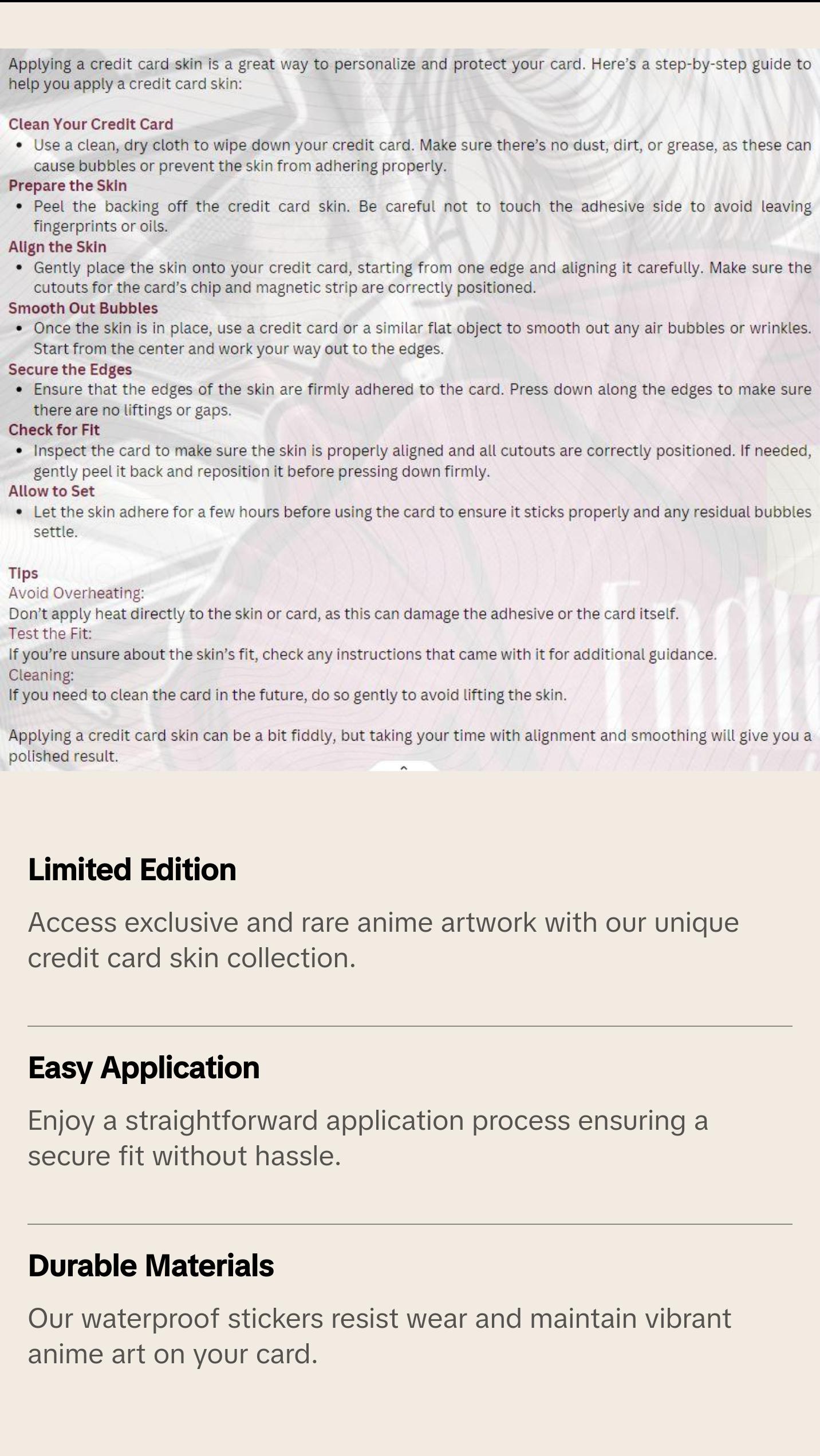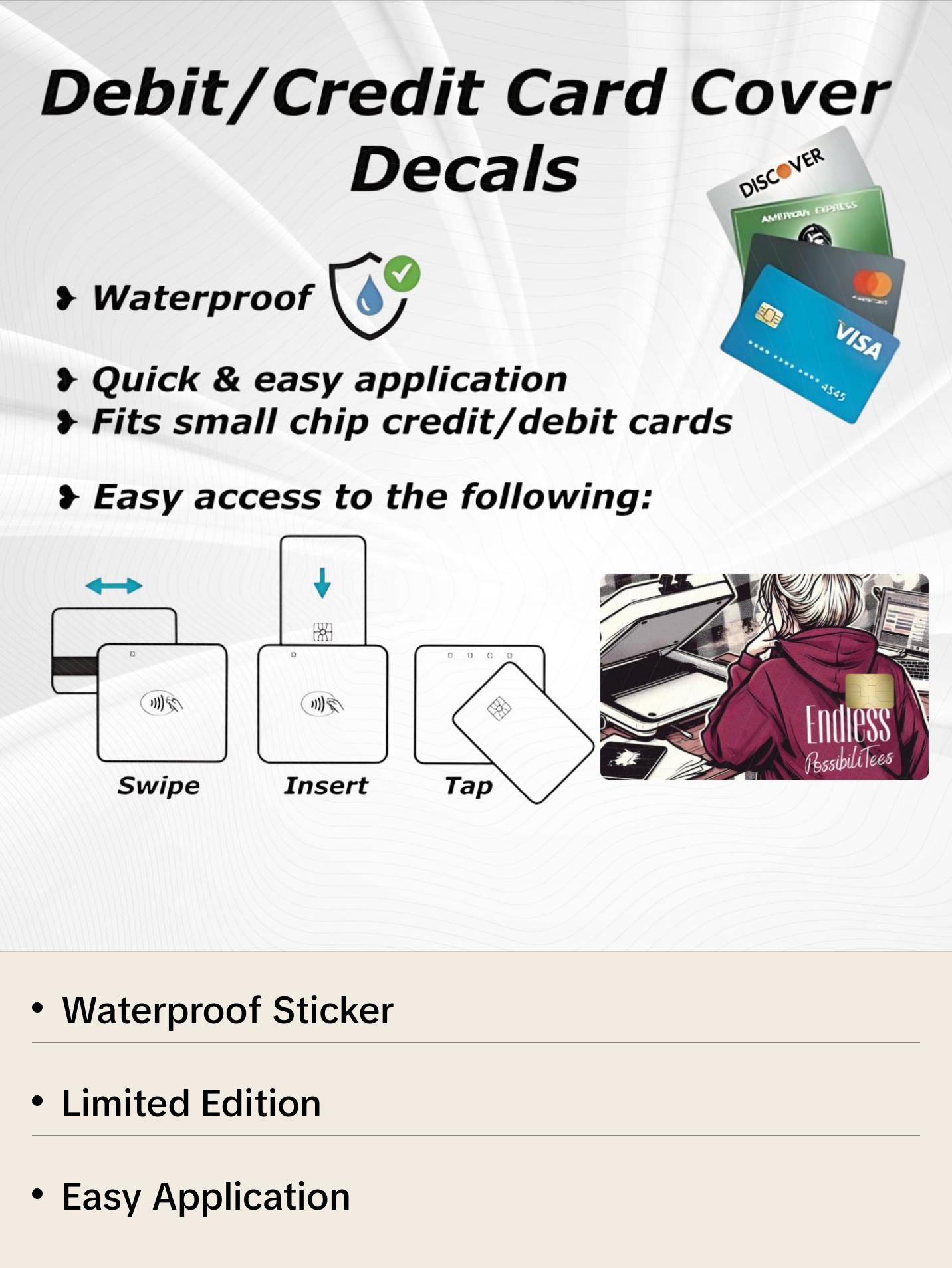 Our stickers are waterproof, making them perfect for customizing your credit or debit card. We also offer sticker cover options: Holographic Clear For any questions or concerns regarding an item or order, please reach out to us, and we'll do our best to assist you promptly. We appreciate your patience and support!