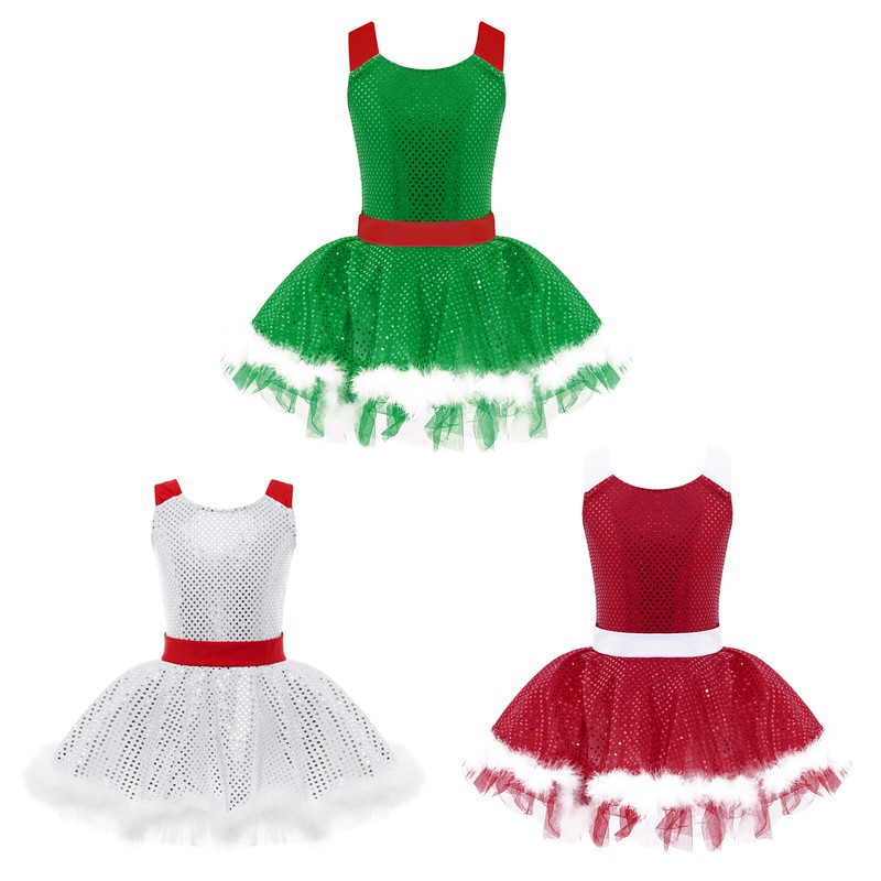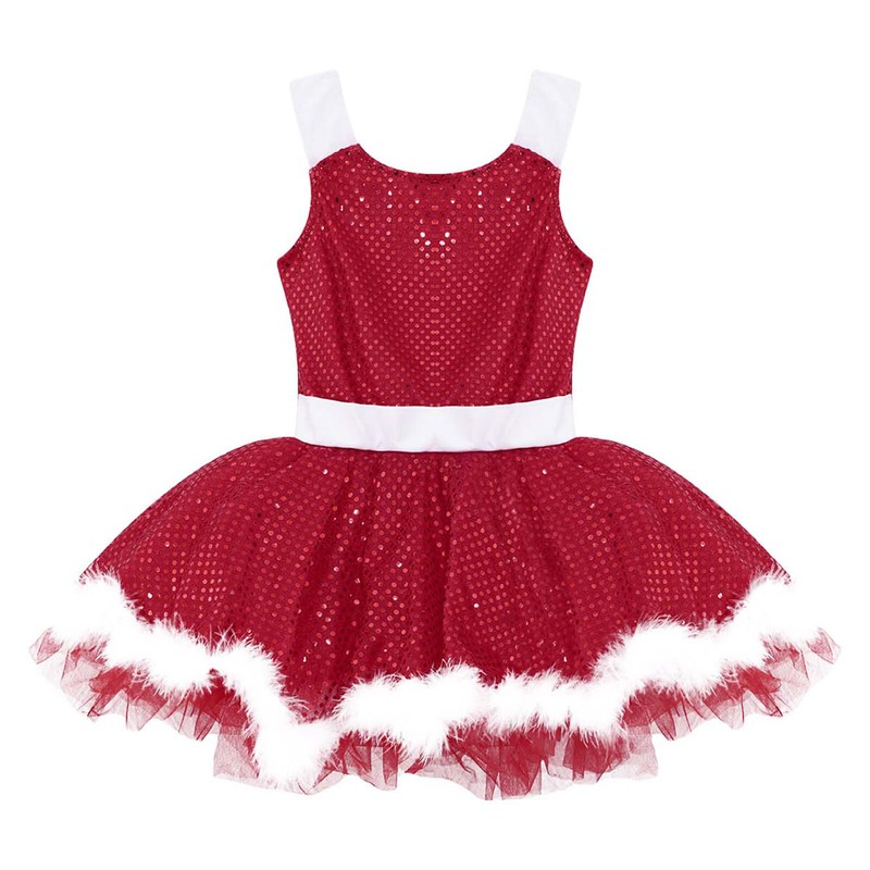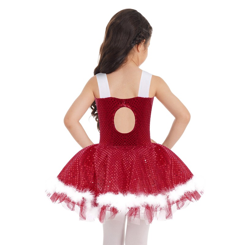 Kids Girls Ballet Latin Dance Costume Cami Dress Sequins Faux Fur Adorned Dance Leotard.