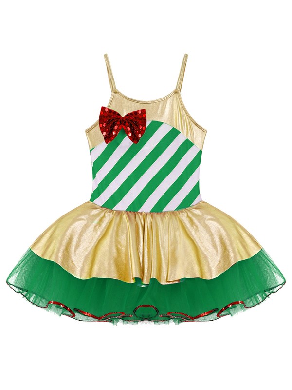 Kids Girls Adjustable Straps Stripes Print Sequins Bowknot Adorned Mesh Tutu Dress Dance Jumpsuit.