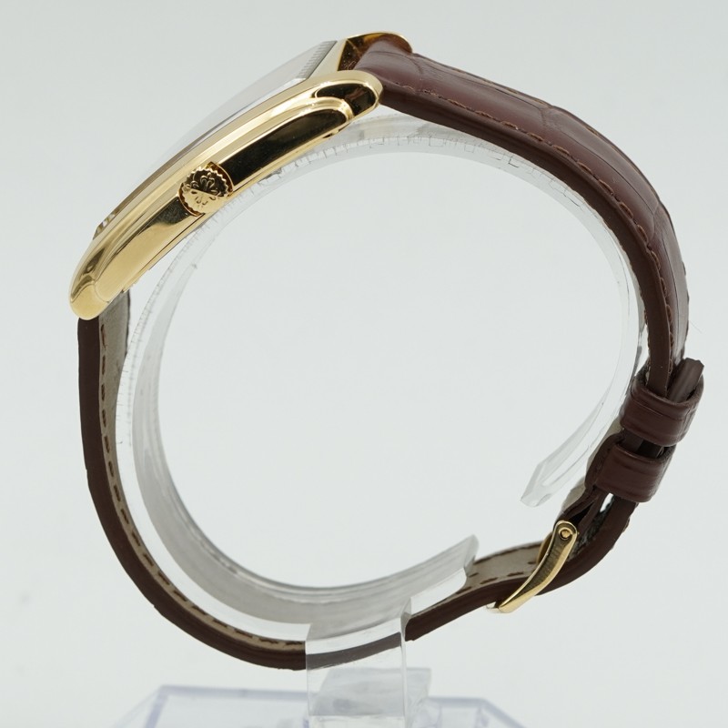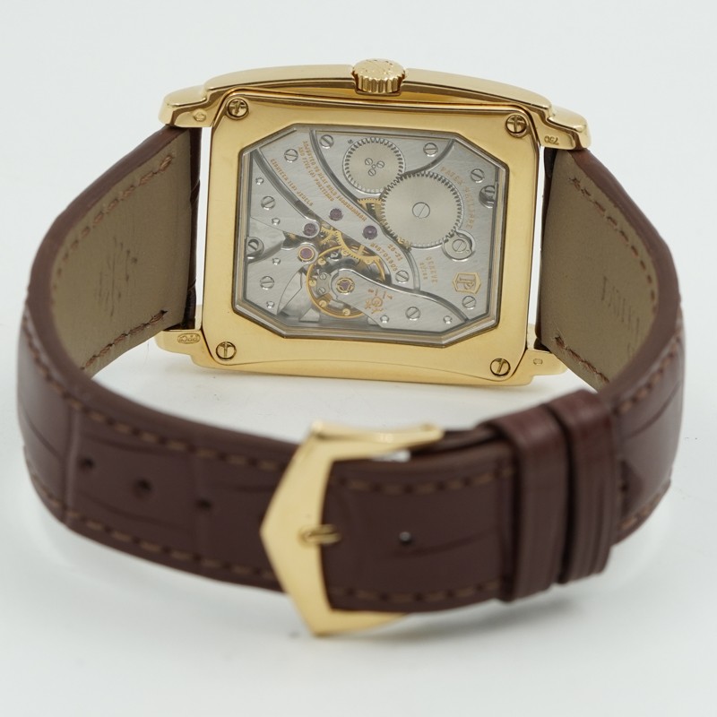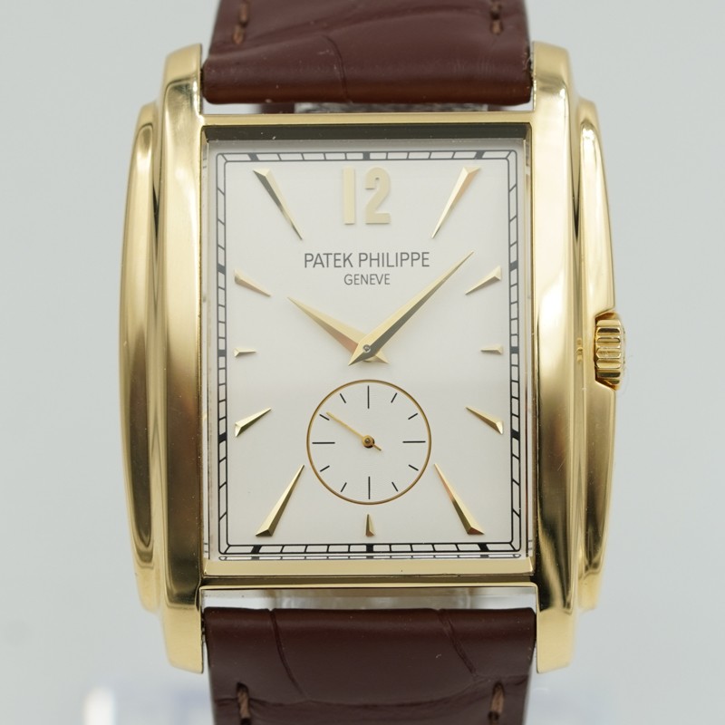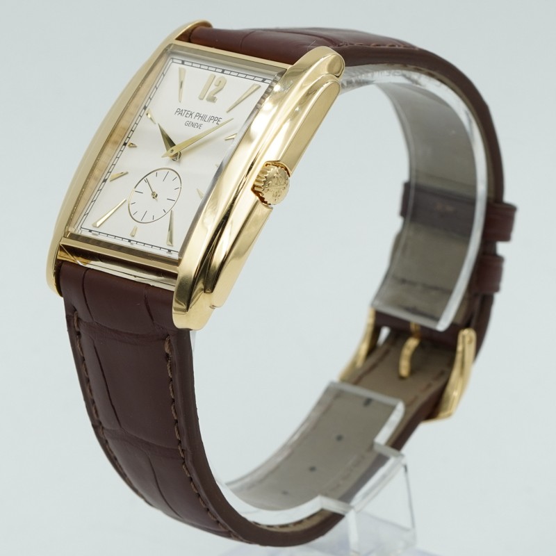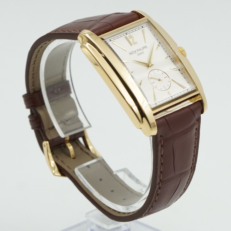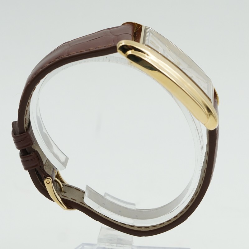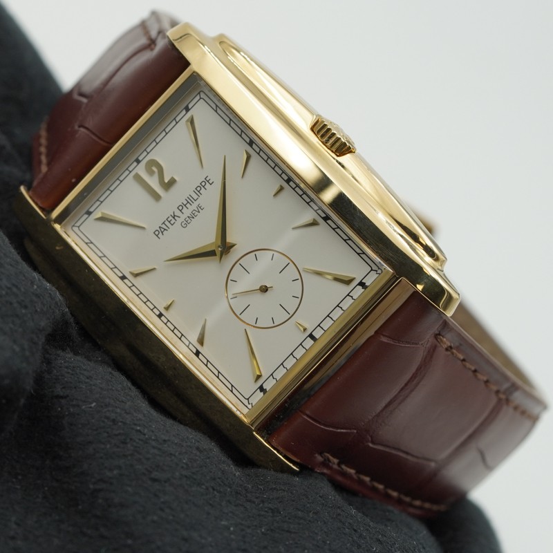 This Patek Philippe Gondolo was recently traded in to the store and is in very good condition. The elegant dress watch features a 42mmx33mm, yellow gold case with matching indices. The watch sits on a brown leather strap. The piece is covered by our 1-year, pre-owned watch warranty. If you have any questions about the watch, please reach out!