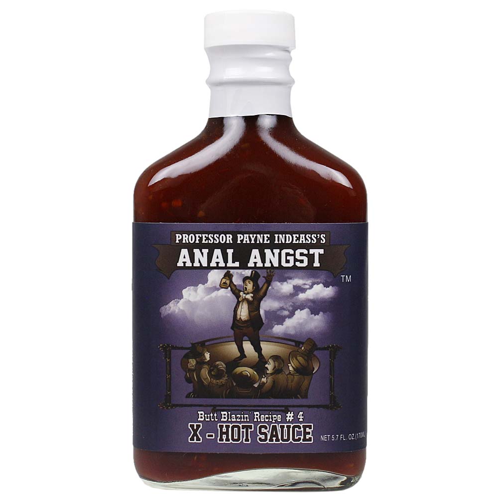 Professor Payne Indeass has spent years perfecting his Anal Angst X-Hot Sauce, and here it is in all its glory. This sauce is made with Habanero peppers, soy sauce, Worcestershire sauce, and garlic. Not a formulation of things we can't pronounce, but instead — a delicious no-nonsense blend that brings great flavor and heat to anything you wish. As good as it tastes going down, you're going to have a rough time tomorrow morning. With a sauce full of flavor and medium heat, you can go to town with your beef, pork, chicken, ribs, seafood, and other favorites. Proudly made in the USA.