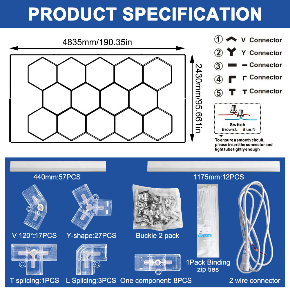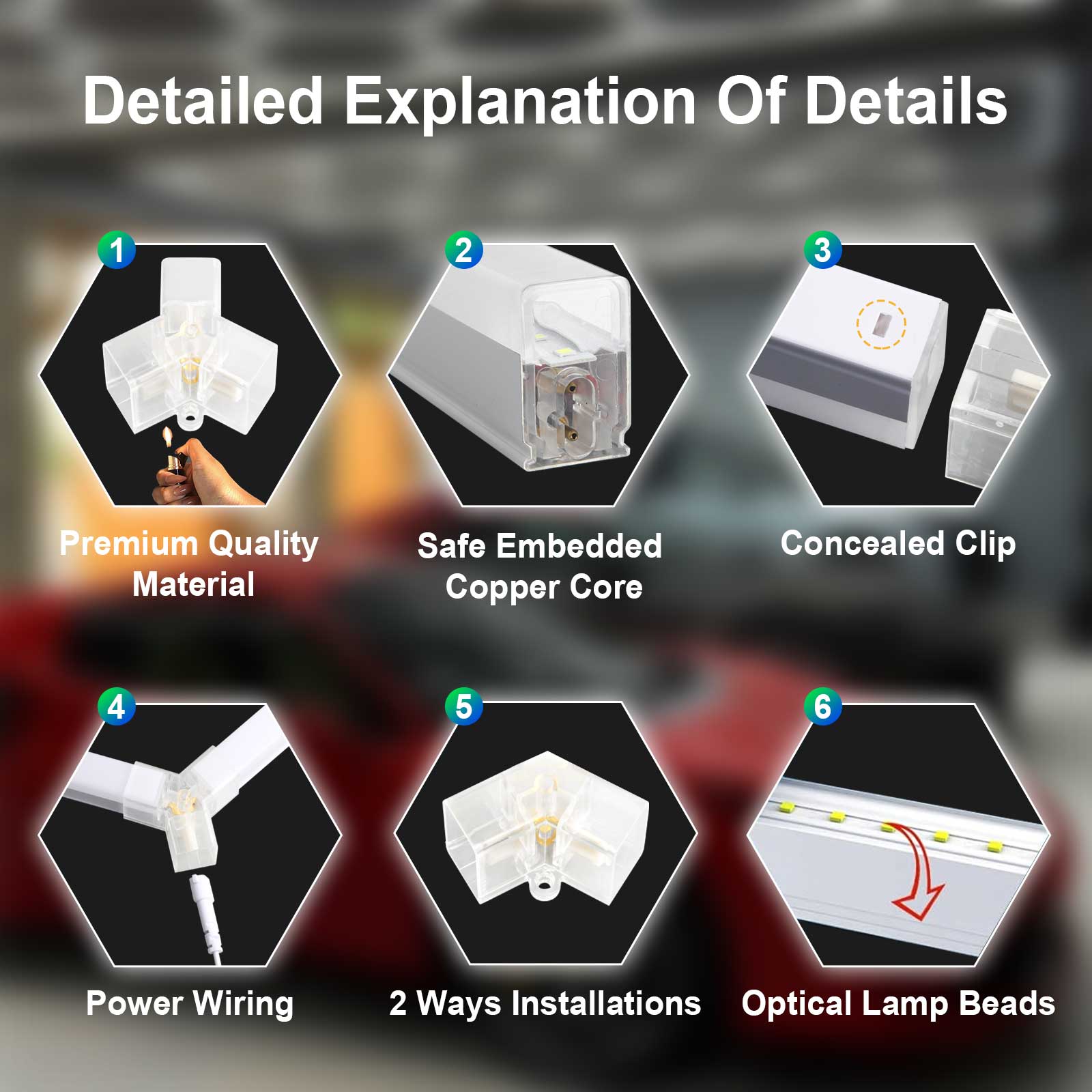 Die sechseckige LED-Garagenleuchte besteht aus hochwertigem PC-Material, das für seine Langlebigkeit, Stoßfestigkeit und hohe Transparenz bekannt ist, und ist vollständig isoliert, um Stromlecks zu vermeiden. Die Verwendung von PC-Material in der Konstruktion dieser Garagenleuchte gewährleistet, dass sie rauen Umgebungen, wie z. B. denen in Garagen, standhält, ohne leicht zu splittern oder zu brechen.