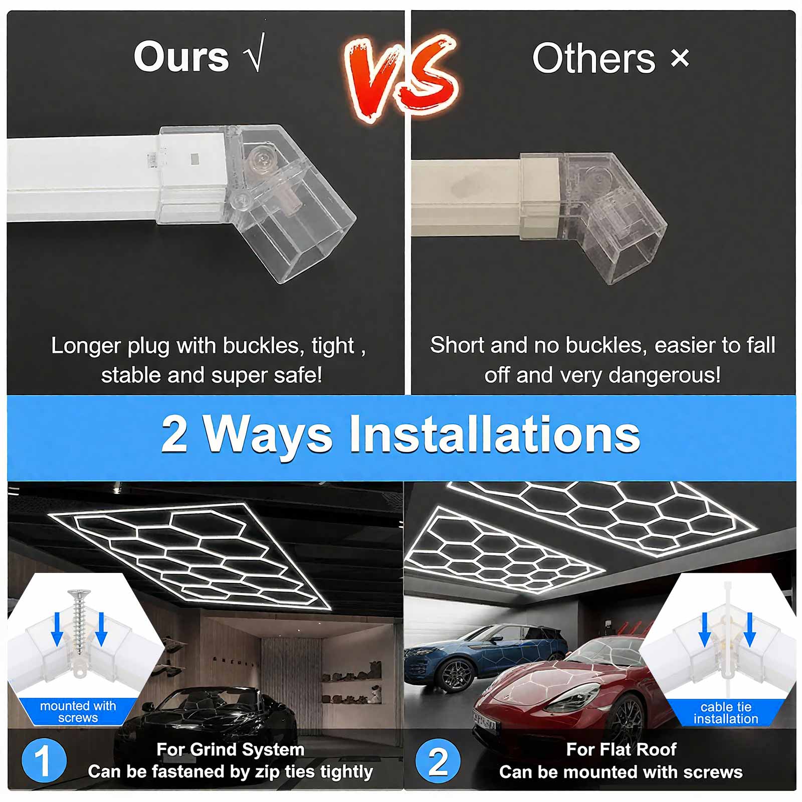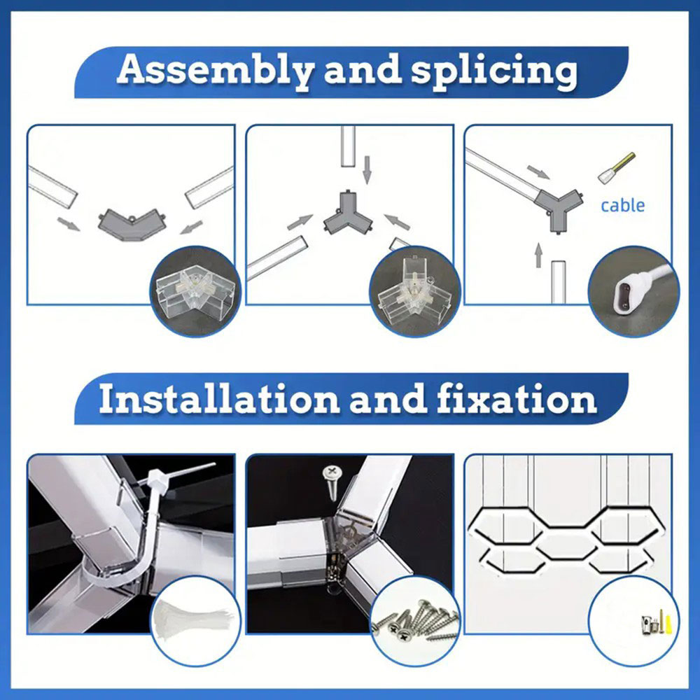 Einfache Installation: Ihre sechseckige Garagenleuchte kann auf zwei Arten installiert werden: je nach Ihren spezifischen Anforderungen und Vorlieben mit Reißverschluss oder Schrauben. Diese Flexibilität erleichtert die Installation und Anpassung, sodass Sie die für Ihren Garagenraum am besten geeignete Methode wählen können. Ganz gleich, ob Sie eine dauerhaftere Installation mit Schrauben oder eine flexiblere Installation mit Reißverschluss bevorzugen, unsere sechseckigen Garagenleuchten erfüllen Ihre individuellen Vorlieben und Anforderungen.