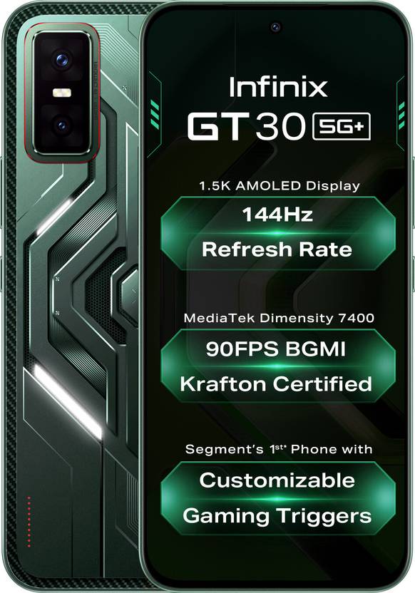 Cyber Mecha 2.0 with Customizable Lights The Cyber Mecha 2.0 design exemplifies geometric precision and modern edginess, featuring bold diagonal lines that resonate with the distinct style of OG gamers. Tailored to gaming enthusiasts, the GT 30 5G+ is available in three striking design themes that embody the essence of gaming culture. Cyber Blue and Pulse Green introduce vibrant hues symbolizing strength and precision, while Blade White offers a clean, minimalist look with subtle yet engaging details. Futuristic accents in contrasting tones enhance the overall aesthetic, and customizable LED lights on the back panel add a dynamic touch, responding to actions like charging or music playback. Flagship-Tier 1.5K AMOLED Display The GT 30 5G+ is equipped with a 1.5K AMOLED display that offers stunning clarity and vibrant, true-to-life colors for an immersive visual experience. With a 144 Hz refresh rate and up to 2160 Hz instantaneous touch sampling rate, it delivers incredibly smooth scrolling and highly responsive touch input—perfect for both gaming and daily tasks. Its peak brightness of 4500 nits ensures excellent visibility even in direct sunlight and enhances your streaming experience. To support comfortable viewing over long periods, the display also features 2304 Hz PWM dimming and is certified by TUV Rheinland for eye care. Console-like Control: GT Gaming Triggers Experience a whole new level of mobile gaming with the GT Shoulder Gaming Triggers! These capacitive triggers bring console-style responsiveness to your gameplay, minimizing the need for on-screen controls and keeping your view clear. But they’re not just for gaming—they can also be customized for convenient shortcuts, such as launching your favorite apps, snapping photos, or managing media playback, enhancing the phone’s overall functionality. Powerful Processor: MediaTek Dimensity 7400 The GT 30 5G+ is powered by the advanced MediaTek Dimensity 7400 which ensures superior gameplay and smooth multi-tasking. Built on a 4 nm architecture, it delivers an improved power efficiency. With MediaTek Adaptive Gaming Technology 3.0, it balances visual quality and performance for smoother gameplay, while the Network Observation System ensures seamless 5G/Wi-Fi switching and enhanced connectivity. It features the NPU 655 for up to 15% better AI performance over previous generations. 64 MP Sony Camera Powered by Infinix AI The GT 30 5G+ is equipped with a 64 MP Sony IMX682 dual rear camera and dual LED flash, delivering sharp, well-lit photos every time. An 8 MP Ultra-Wide lens lets you effortlessly capture expansive landscapes with clear detail. With over 12 photography modes and smart features like AI Eraser and AI Extender, your shots are always optimized. Plus, the 13 MP front camera with screen flash ensures stunning selfies in any lighting condition. XBoost AI: Pro-level Optimization Unlock next-level gaming performance with XBoost AI, your gateway to cutting-edge software optimization. With just one tap, Esports Mode silences distractions by blocking notifications, calls, alarms, and system bars, while boosting CPU performance, network speed, touch responsiveness, and clearing background apps for a smooth, uninterrupted gaming session. Network Enhancement ensures optimal connectivity for your current game, and customizable Performance Modes allow for smart resource management—delivering peak performance without compromising your gameplay. Work Smarter, Play Harder with Infinix AI The GT 30 5G+ delivers a playful yet powerful AI experience through One-Tap Infinix AI, featuring creative tools like AI-generated wallpapers from text or images, AI Extender, which smartly expands images beyond their original frame and XBoost AI features that elevate your gaming experience. Enhancing the experience further is Folax, the AI voice assistant that can check the weather, launch apps, or simply chat with you. Additional features such as Circle to Search, Call Summary, and AI Writing Assistant take your productivity and convenience to the next level. 6 Layer Vapor Chamber Cooling System Inside the GT 30 5G+ lies a 3D VC Cooling system designed for efficient heat management, using high-conductivity materials like graphite and copper in an optimized layout. This advanced cooling system helps maintain optimal temperatures during intense gaming or heavy multitasking, preventing thermal throttling. With a substantial 5400 mm² surface area, it ensures consistent, high-performance output even under demanding conditions. 5500 mAh Massive Battery with Bypass Charging The GT 30 5G+ houses a robust 5500 mAh battery, delivering long-lasting power for all your needs. Say goodbye to charging hassles with the included 45 W Type-C Fast Charger. Thanks to All-round FastCharge 3.0, you get advanced features like wired reverse charging, bypass charging, Smart Charge mode, and Low-Temp Charge mode—designed to enhance charging efficiency while protecting battery health. Life-like Haptic Response The GT 30 5G+ is equipped with a precision X-axis linear motor that provides crisp, lifelike haptic feedback, adding depth to both gaming and everyday use. Its refined vibrations enhance user interaction with greater accuracy. Paired with a responsive 6-axis gyroscope, the device ensures smooth and precise tilt controls, delivering an immersive and intuitive gaming experience. The Functional and Intuitive XOS 15 The brand-new XOS 15, built on the latest Android 15 platform, offers a wide range of customization options, allowing you to personalize icon size, shape, and color to suit your preferences. It comes equipped with intelligent features that enhance multitasking—such as Floating Window and Dynamic Bar—while also improving performance through Game Mode and strengthening security with tools like Theft Alert and Peek Proof. With XOS 15, your smartphone experience is more tailored, powerful, and secure than ever. Optimized for Big Storage Needs Storage 