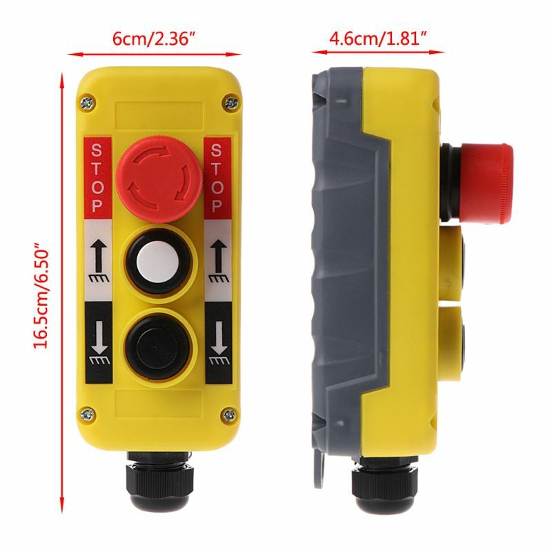 Waterproof Industrial Double Buttons Remote Control Push Button Switch with Emergency Stop for Electric Crane Hoist Pendant Control Station 1. Name: Waterproof Push Button Switch for Crane Pendant 2 Buttons + Emergency Stop, Yellow 2. Working current: 5A. 3C rated voltage range: above 440V 3. Material: ABS Plastic, life: 1000000 times 4. Size: 4.6×6×16.5cm (1.8×2.4×6.5") 5. Operating temperature: -25 +75 (°C) 6. Contact structure: composite button 7. Contact resistance: ≤50M(Ω). Insulation resistance: 50M (MΩ) 7. Package include: 1 x Push Button Switch 8. Notice: * Please allow 1-5mm error due to manual measurement. Please make sure you do not mind before you bid. * The colors may have different as the difference display, please understand.