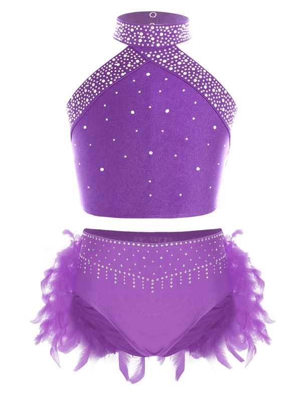 Dance briefs are decorated with sparkling rhinestones on the front and feather on the back.