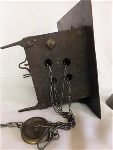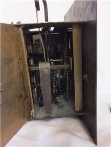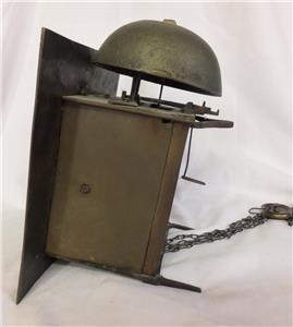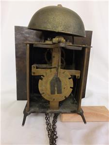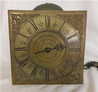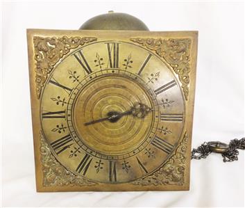 Sizes: Dial 9 inches square ( 23 cm) Chapter ring 8 1/4 inches diameter. Depth including spikes 6 1/2 inches. Movement 4 1/2 inches deep x 5 5/8 inches wide x 6 inches high. Bell 5 3/8 inches diameter.
