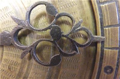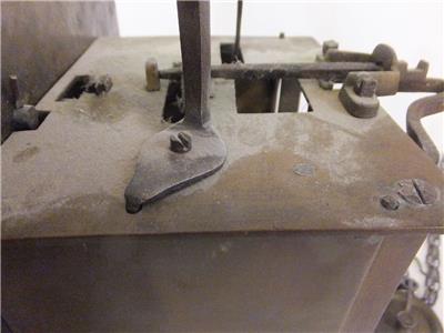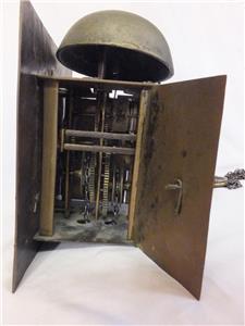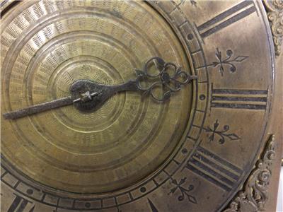 The clock is running and striking correctly, but has not been serviced or cleaned recently, so I suggest at least stripping, cleaning and oiling it before running it for any length of time. There are minor faults that could be repaired: The original hand is damaged at its end, two of the three loops being cracked through and displaced. An urgent repair of this is needed to avoid losing the tip of the hand. See pictures below.