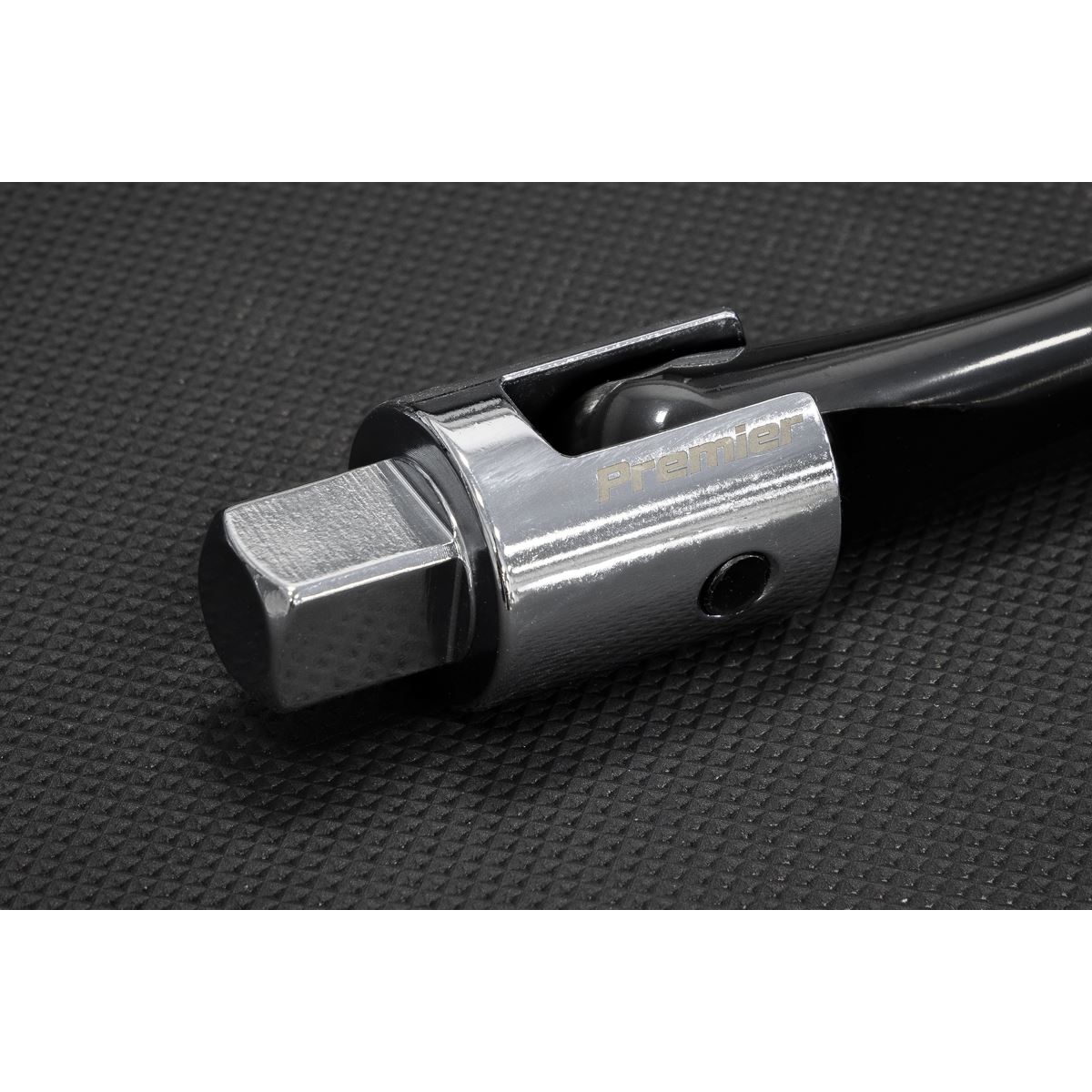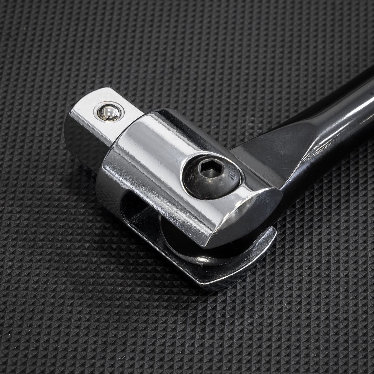 Barra de acero al Cromo Vanadio endurecido y revenido con acabado por electrodeposición totalmente pulido. Mango largo y delgado y retención de casquillo con resorte. Articulación articulada totalmente reemplazable*.