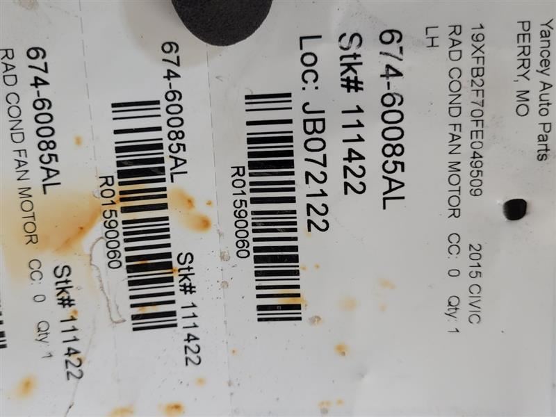 This listing is for a USED 12-15 HONDA CIVIC LH Driver Radiator Fan Motor Fan Radiator Left Hand . This part was removed from a 2015 CIVIC stock number 111422 and the mileage was 157000 miles. Part Condition Notes: LH 19020R1AA01 This part will fit these makes and models with these options: CIVIC 12 Fan Assembly; Sdn, 1.8L, radiator (LH), rimmed blade