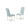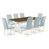 EAST WEST FURNITURE 9-PIECE DINING ROOM TABLE SET- 8 AMAZING DINING PADDED CHAIRS AND 1 KITCHEN DINING TABLE The 9-pc kitchen table set consists of 8 dining padded chairs and 1 dining table. These parson chairs have a Linen Fabric seat, Button Tufted Chair Back, and the rectangular table includes a rectangular top and Wooden Legs. The padded parson chair seat and the chair back is made of Linen Fabric in a Baby Blue color dining chairs hardwood structure and the Linen Fabric seat is very easy to clean. You can clean dirt easily and often to save time by using a damp cloth. These parson chairs and the rectangular table is a fantastic choice for your dining room or kitchen. The easy construction of the kitchen parson chairs and the dining table as well as screws of the same size that allow quick and easy put together. FEATURES: Kitchen Table Set Material: Asian Hardwood Seating Material: Linen Fabric Wood Dining Table Top Color: Distressed Jacobean Modern Kitchen Table Legs Color: Wire brushed Linen White Dining Chair Legs Color: Linen White Parson Chairs Fabric Color: Baby Blue Kitchen Dining Table Dimensions: Length 72; Width 40; Height 30. Dining Padded Chairs Dimensions: Length 22; Width 19; Height 41. Included in the Package: The Awesome Rectangular Table and 8 Lovely Upholstered Dining Chairs.