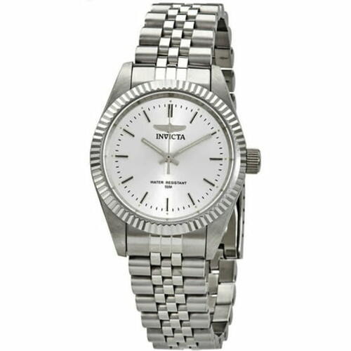 Silver dial enhanced by luminous silver-tone hands. Silver-tone stainless steel case with a silver-tone stainless steel band. Quartz movement. 50 meters / 165 feet water resistance. Fixed bezel. Scratch Resistant Mineral crystal. Solid caseback. Fold Over clasp. Pull / Push crown. Case size 36 mm x 11 mm. Band 18 mm x 7.75 incheslong. Invicta 29396 Specialty Watch.