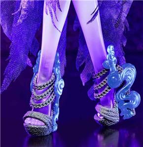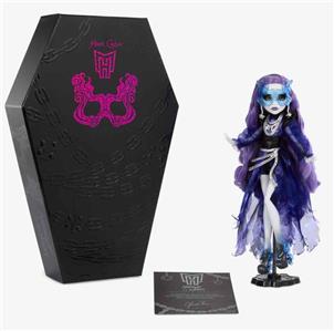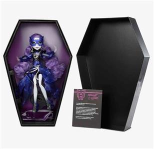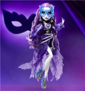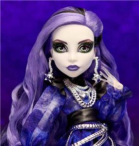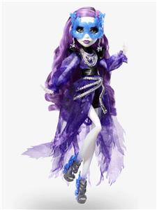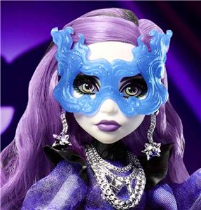 For the third doll in the 2023 Monster High Haunt Couture Midnight Runway Collection, we’re giving our ghostly gossip ghoul a glam masquerade makeover. Spectra Vondergeist appears in all her spooky splendor, wearing an airy mesh dress featuring puff sleeves and leather accents. Her tumble of long purple curls and a swirling sculptural mask give her an ethereal charm. The silver chain accents and translucent details at her arms and legs reflect her ghostly heritage.