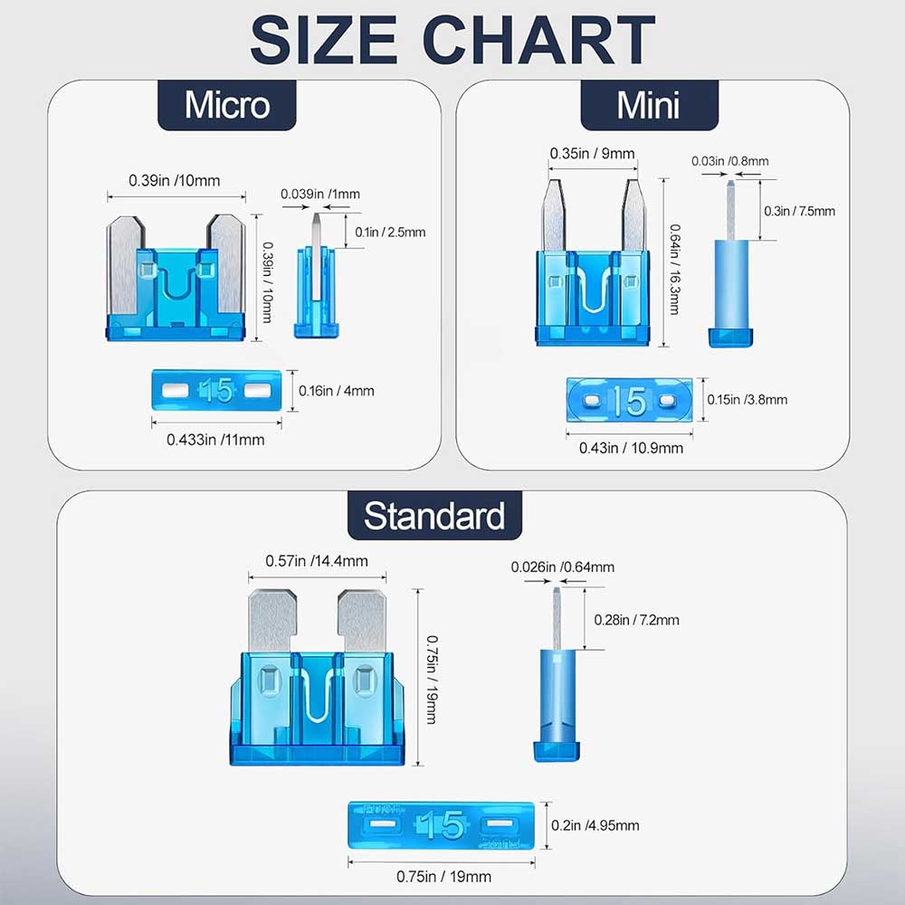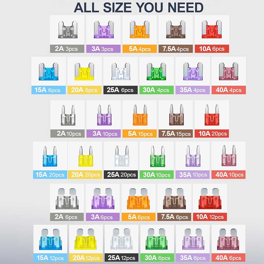 【Hochwertiges Sicherungsset】 – Das Set enthält 50 Mikrosicherungen, 160 Minisicherungen und 90 Standardsicherungen. Drei Sicherungstypen verfügen über 11 Nennströme (2 A / 3 A / 5 A / 7,5 A / 10 A / 15 A / 20 A / 25 A / 30 A / 35 A / 40 A) sowie einen Sicherungszieher.