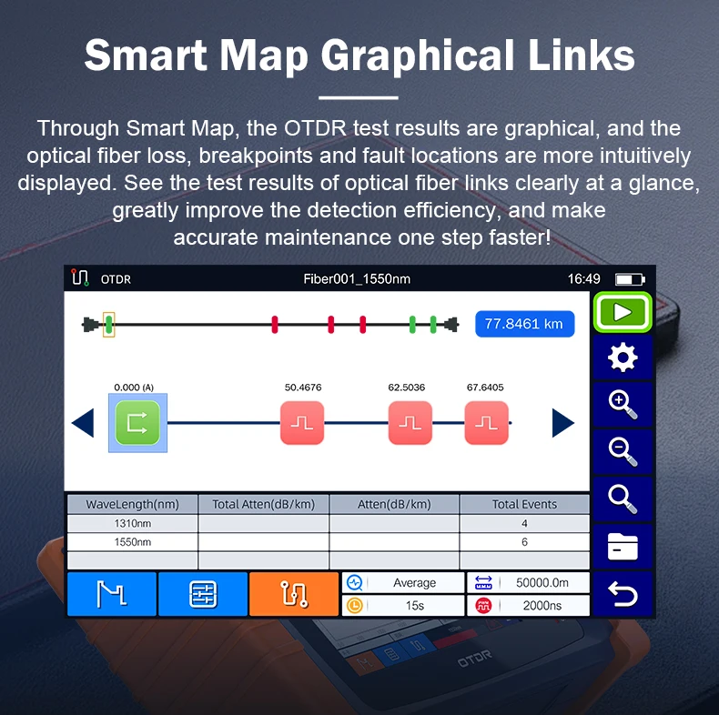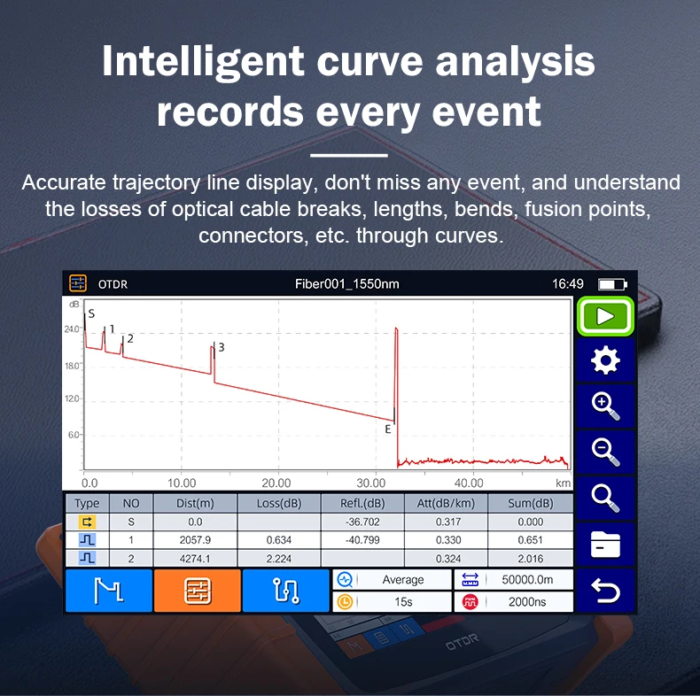 --- Intelligent curve analysis records all events . understand the losses of optical cable breaks , lengths , bends , fusion points , connectors , etc . through curves .