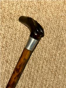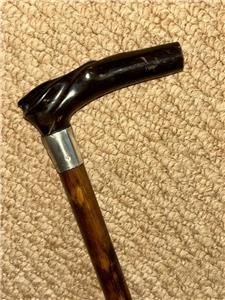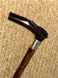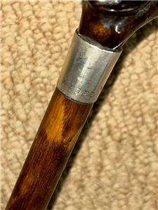 This petite walking stick features a bovine horn fritz handle with hand-carved detailing, furnished with a silver collar hallmarked for: