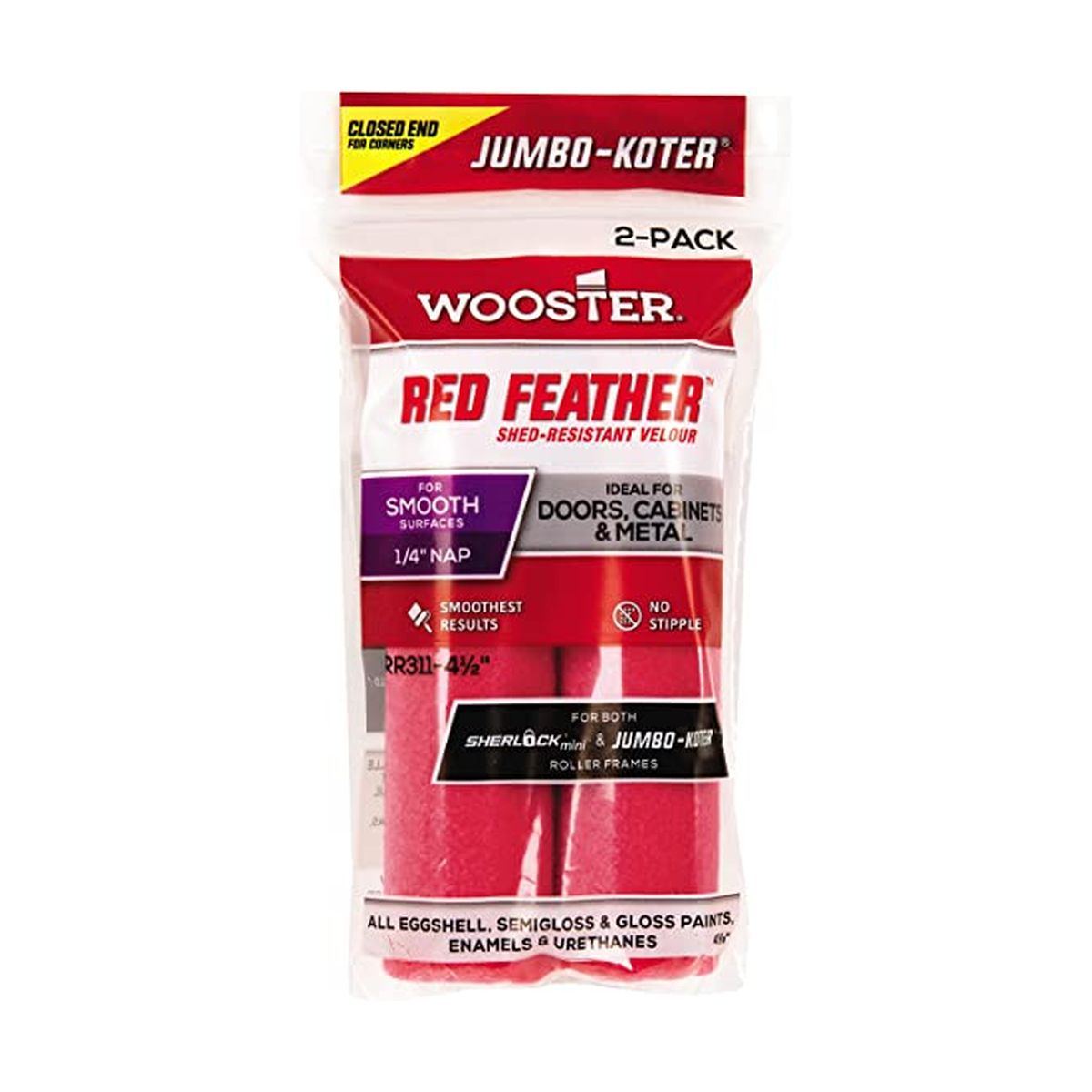 Includes (2) RR311 4.5 inch Roller covers. 4.5" long roller cover with 1/4" Nap. Red shed-resistant velour rolls out a feather-smooth finish with all eggshell, semigloss, and gloss paints, enamels, and urethanes. Closed end saves time when painting corners. Use with RR028, RR013, RR014, RR323, R212, Jumbo-Koter roller frames.