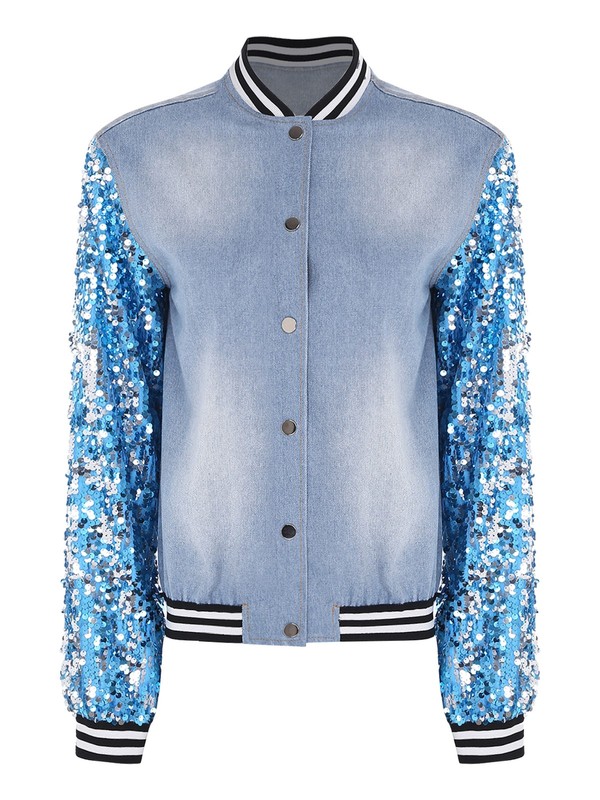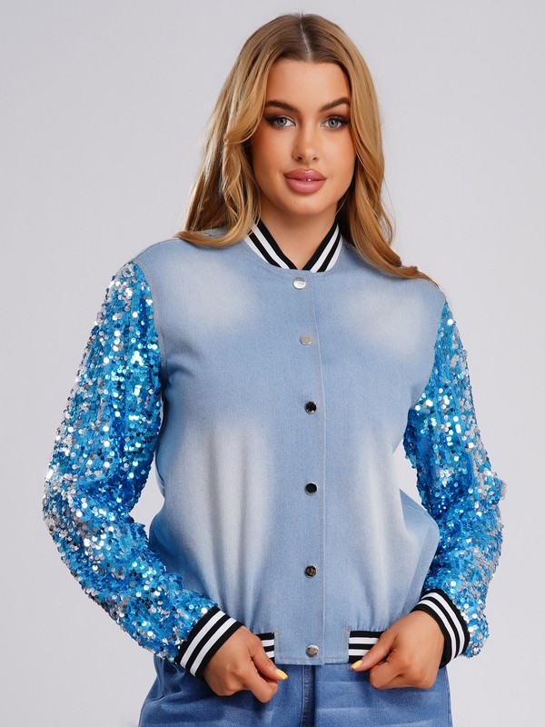 Womens Denim Baseball Jacket Top Glittery Long Sleeve Outerwear for Daily Casual