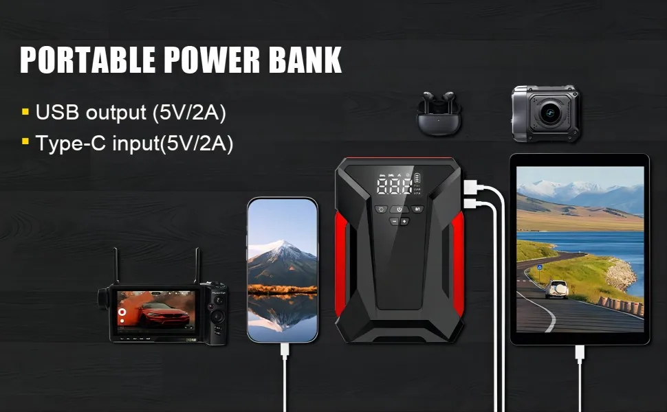 8-IN-1 JUMP STARTER: Not only is it a car jump starter, it can also be used as a pump, portable battery pack, emergency LED light with 3 modes (flashlight, SOS, strobe) and power bank to charge mobile phones, tablets and other USB devices. hard press power button 3 seconds to turn on.