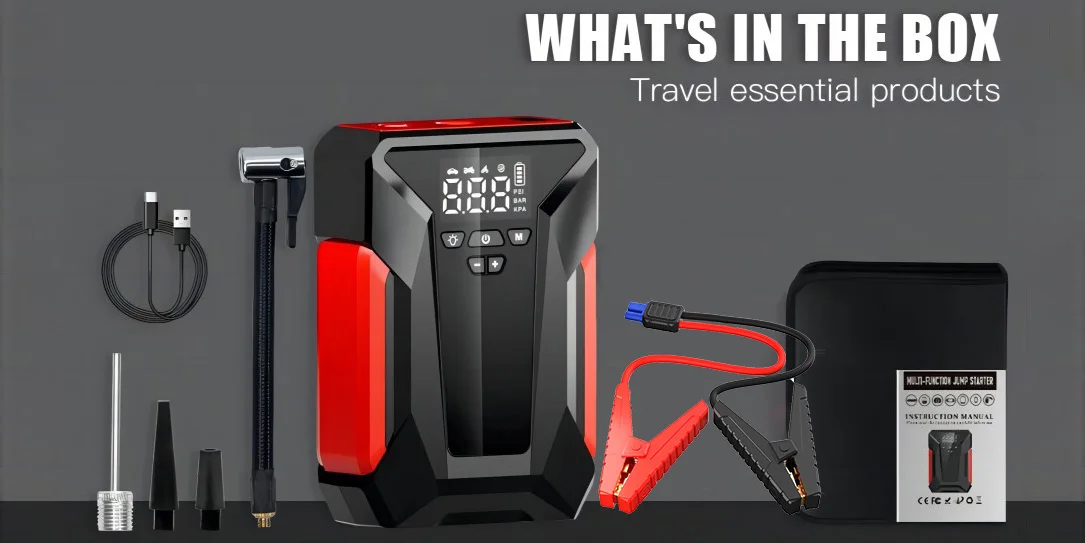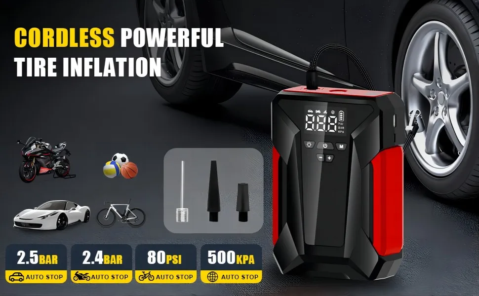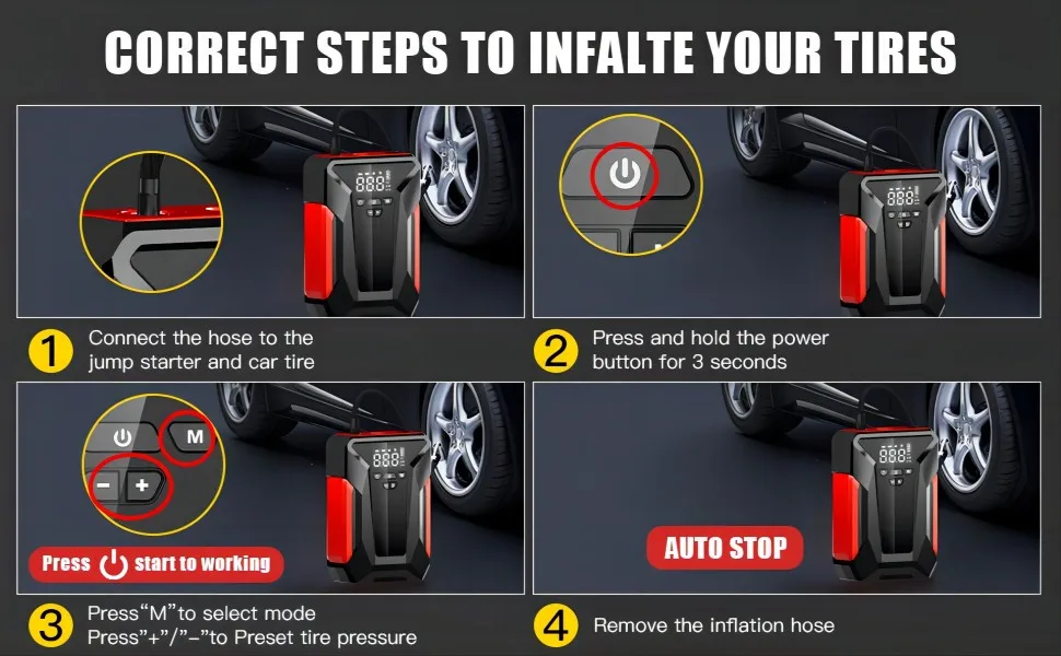 INFLATION FUNCTION: The car battery jump starter is equipped with tire inflation and 3 types nozzles, supporting 3 optional units (PSI, BAR, KPA), which can inflate various tires and balls. In addition, there are smart screen and tire pressure detection function.