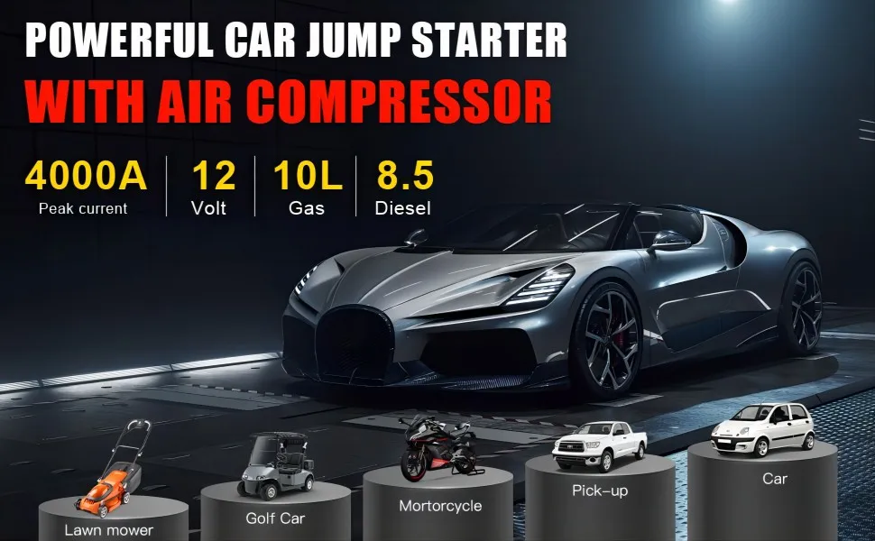 HIGH POWER BOOSTER: The car battery charger with a 4000A peak current, can start the 12V vehicles up to 10L Gas or 8.5L Diesel engines. The powerful battery booster works even in extreme temperatures. Suitable for car, truck, motorcycle, boat, RV or tractor and so on.