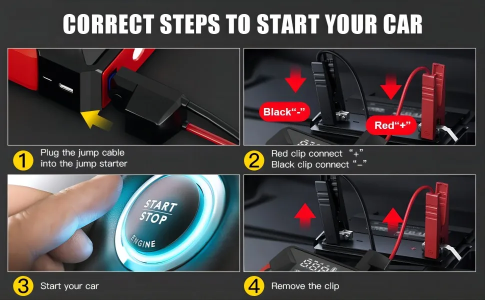 SAFETY PROTECTION: The upgraded jumper cable adds a smart chip, so you don't have to worry about connecting the wrong positive and negative poles of the car battery, or short circuits and sparks. It is very safe and can be connected to any car below 12V.