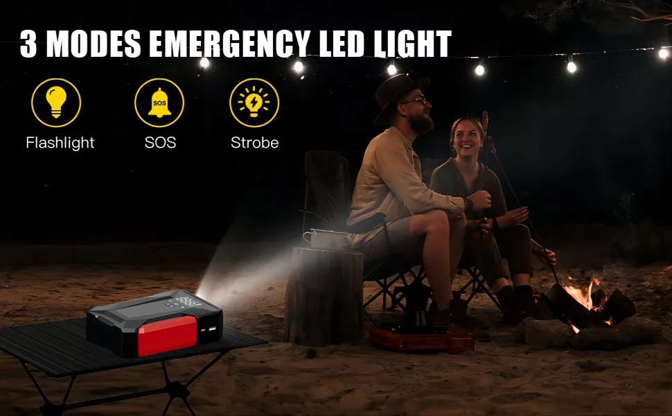 EMERGENCY LED LIGHT: The jump starter battery pack features 3 LED light modes. First of all, it can be used as a flashlight, which is very bright and lasts long time. Secondly, when you need rescue for survival, turn on SOS and strobe mode. Ideal for camping and long drives.
