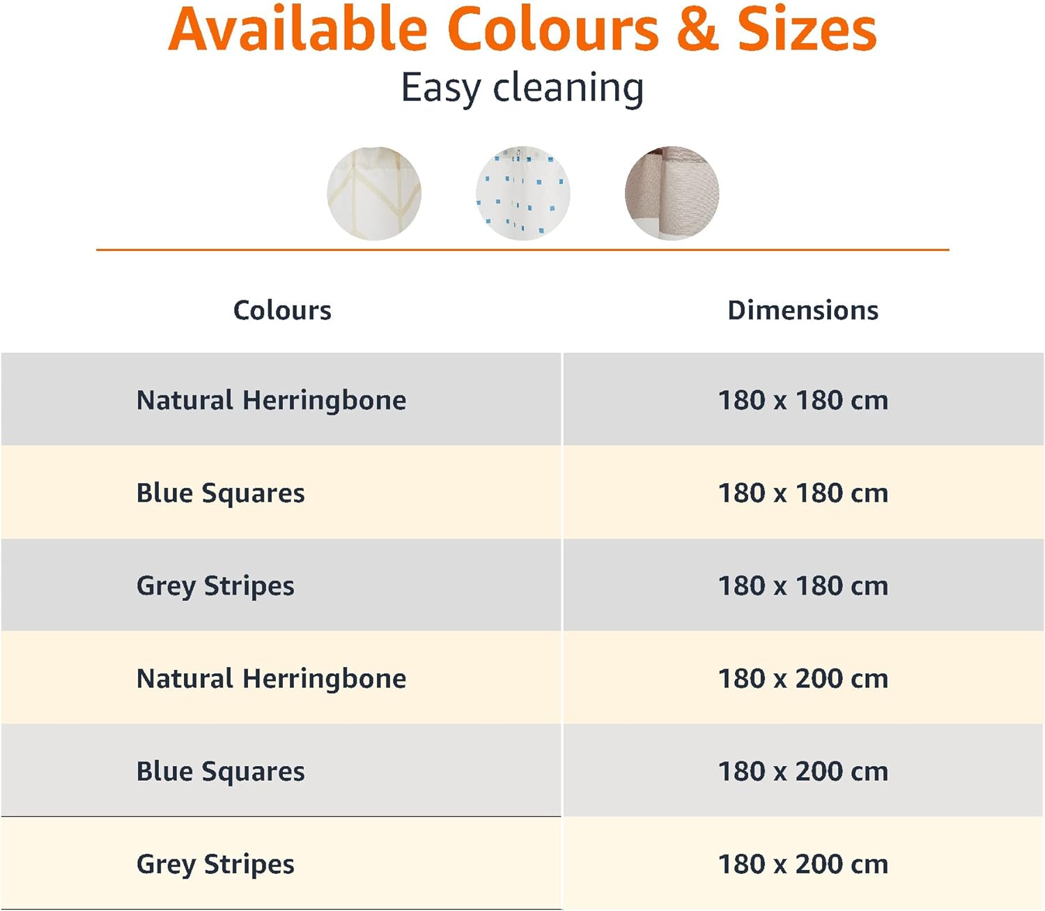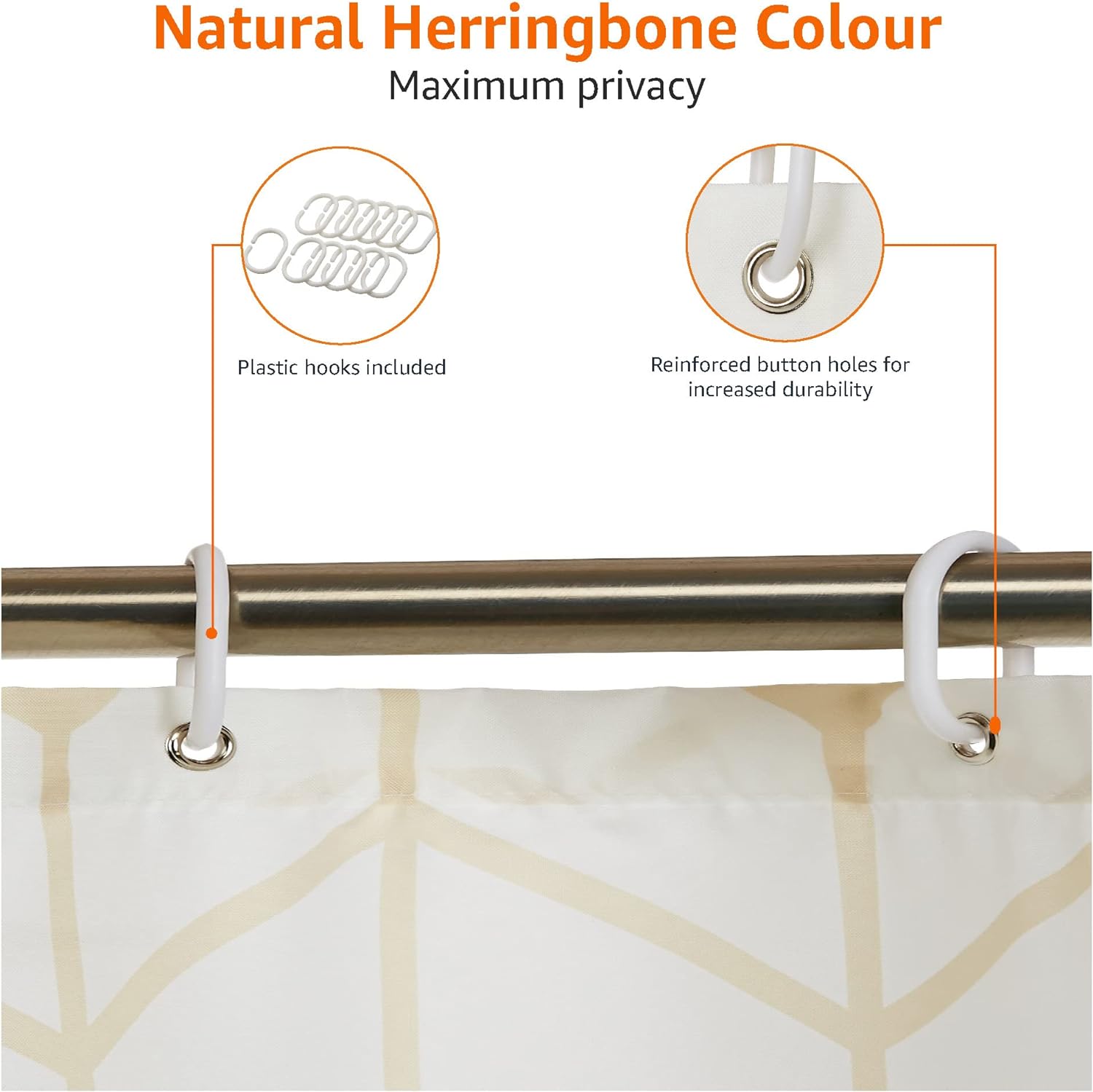 Dimensions : 180 x 200 cm ; garantit l'intimité. Aspect élégant ; facile d'entretien, lavable en machine. Garantit l'intimité tout en étant très décoratif ; peut être utilisé avec ou sans doublure. 12 œillets métalliques inoxydables le long de la partie supérieure renforcée – crochets de suspension en plastique inclus. Rideau de douche imprimé 100 % polyester avec motif à chevrons de couleur naturelle.