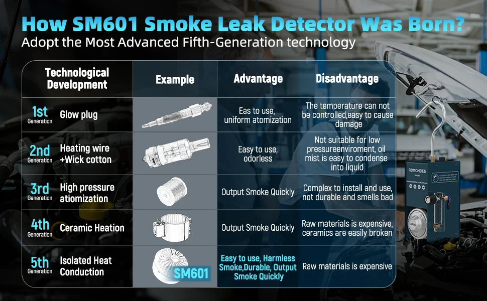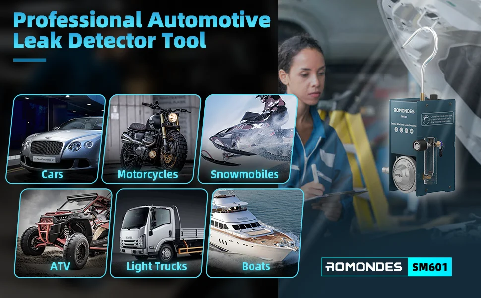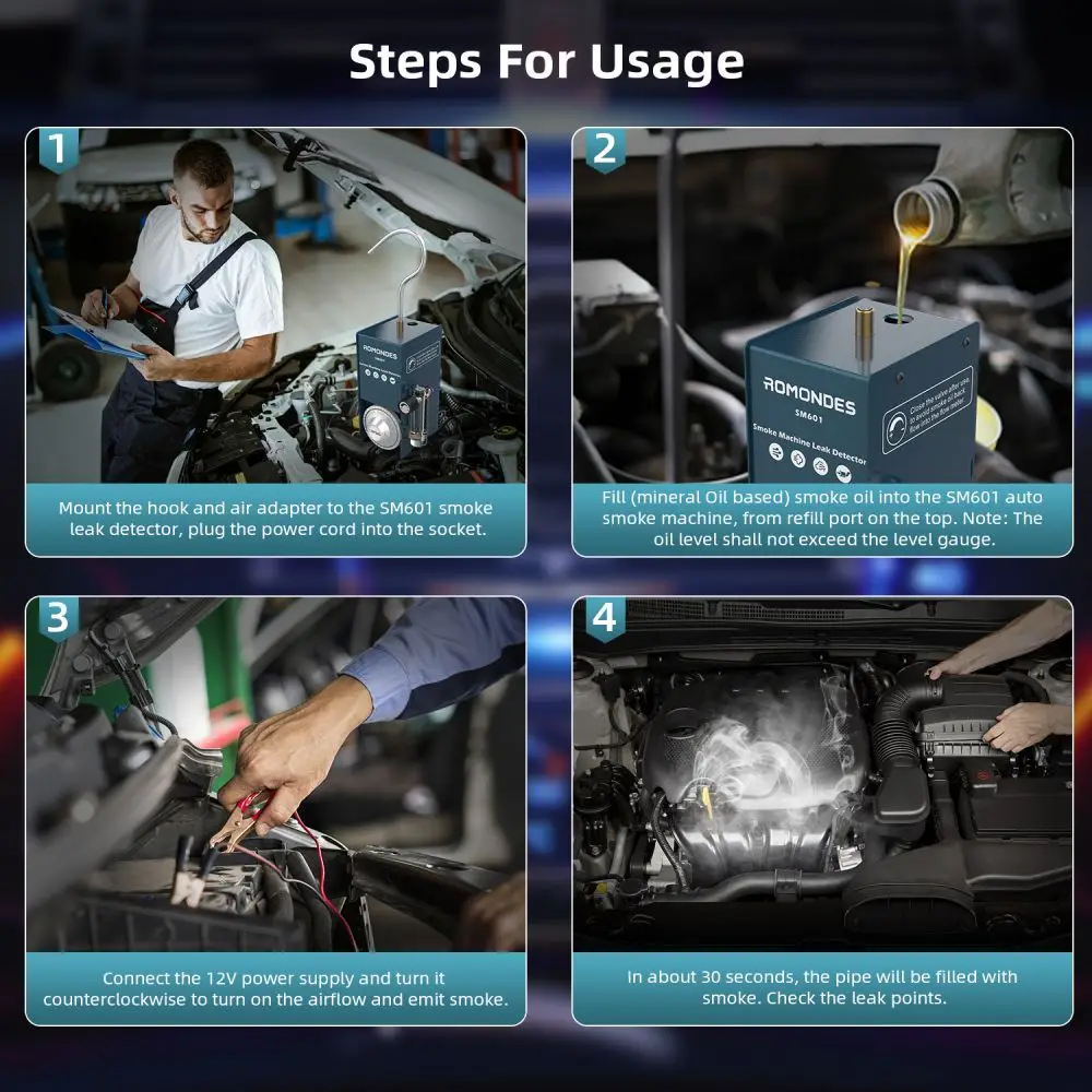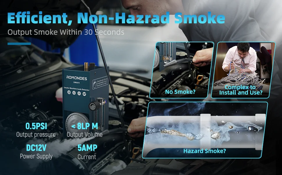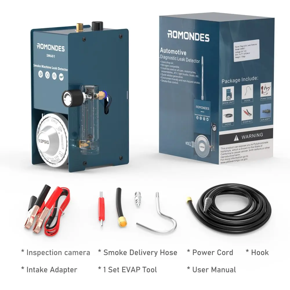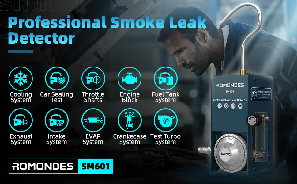 Romondes SM601 Car Smoke Leak Tester EVAP Smoke Machine Auto Oil Leak Detector Vacuum Fuel Pipe Leak Tester for Cars Motorcycles Romondes SM601 Car Smoke Leak Detector is a universal and professional auto pipe leak detect tool, it will help you to locate hard-to-find leaks in any sealed system, such as Cooling System Test, Car Sealing Test, Throttle Shafs, Engine Block Test, Intake System Test, Exhaust Systems Test, Crankcase system test, Fuel Tank System Test, Turbo System Test, Various Pipe Fittings Test, etc. Why You Need An Automotive Smoke Machine? ✔【Diagnose All Types of Leaks】As a professional smoke machine automotive, SM601 can help you to locate hard-to-find leaks in any sealed system, like EVAP system, intake/exhaust system, vacuum leaks, sealing test, fuel tank system, turbo test, crankcase system, EGR system, various pipe fittings test, Throttle Shafts, Door&Windows seals, Oil Leaks ... and more! ✔【Portable Design & Safe】 Romondes SM601 EVAP smoke machine comes with a hook allows you to easily store anywhere in the workshop. The automotive smoke machine produces smoke instantly and the output is healthy, safe, harmless dense smoke. And intelligent power shutdown is achieved when the auto smoke machine exceeds the housing limit of 75°C. ✔【Easy to Use and Efficient】SM601 smoke leak tester is easy to operate. Just four simple parts, easy to fix. This car smoke machine can help you quickly and accurately determine whether the fault is caused by pipeline leakage, and detects even the smallest leak. It can output the smoke within seconds, improve the efficiency of diagnose dramatically. ✔【Works with Most Cars】SM601 vacuum leak tester could be used on all cars, motorcycles, snowmobiles, ATV, light trucks, boats, etc, and wide vehicle coverage. Specification:▶Voltage: DC 12V; Output pressure:0.5PSI; Output volume: <8LPM; Smoke current: 5 AMP; Heating Material: mineral Oil or Baby Oil (oil not included). ✔【What You Get】A automotive smoke leak detector, 1*Power Cord, 1*EVAP Kit, Air Adapt(U.S. Standard), 1*Smoke Delivery Hose,1*Hook. FREE Gift: BT200 battery tester and a replacement metal plug. We also have a professional technical team and customer service to help at any time.  Romondes SM601 Advanced Technology ▶Crankcase System Test: excessive pressure or corrosion of the crankcase is the main reason to damage the seal of the crankcase and cause oil leakage.