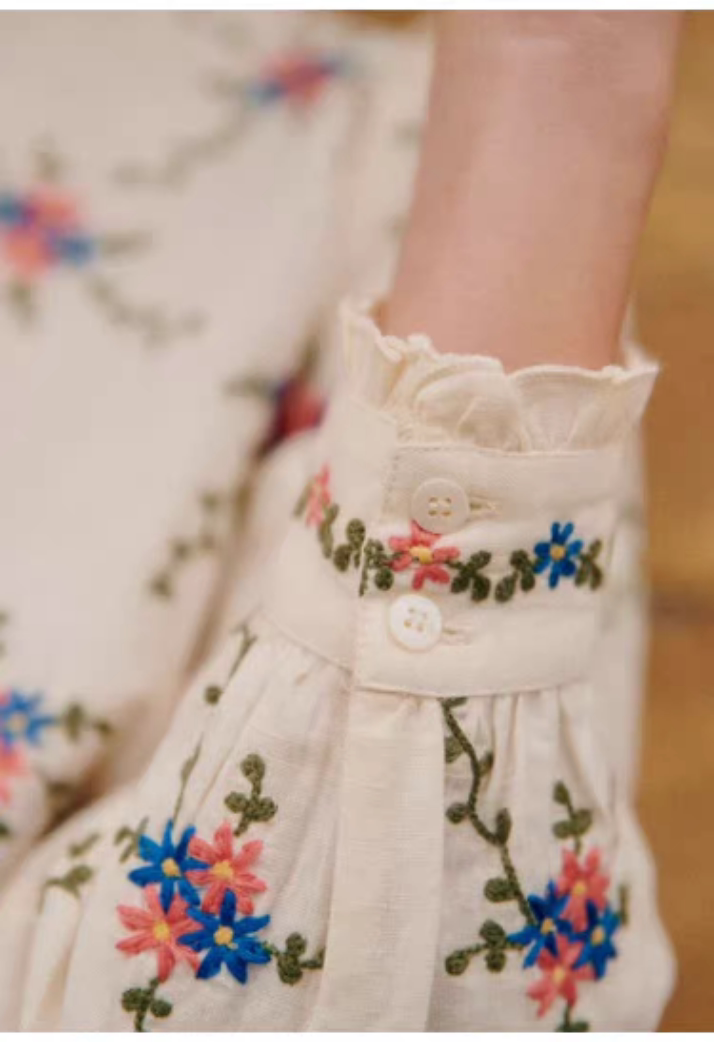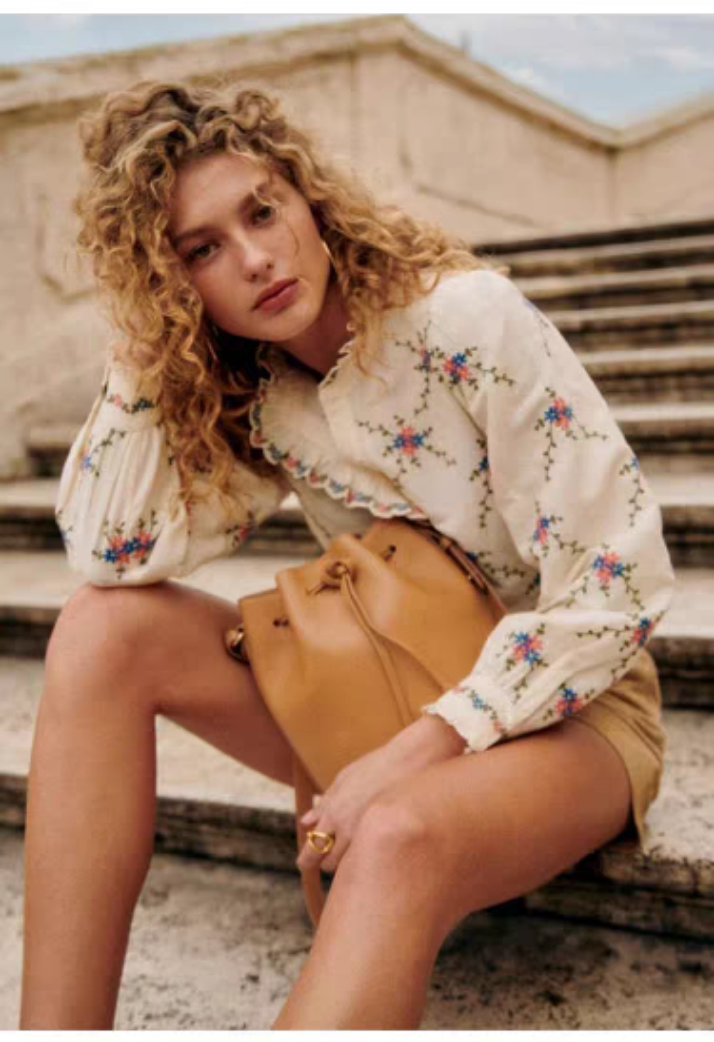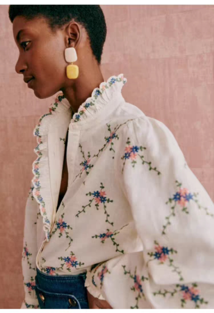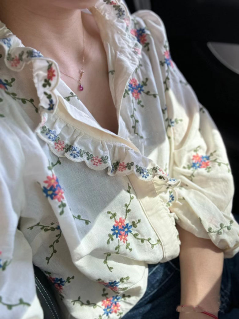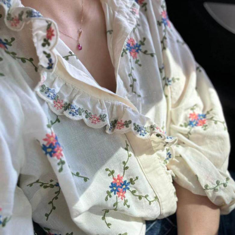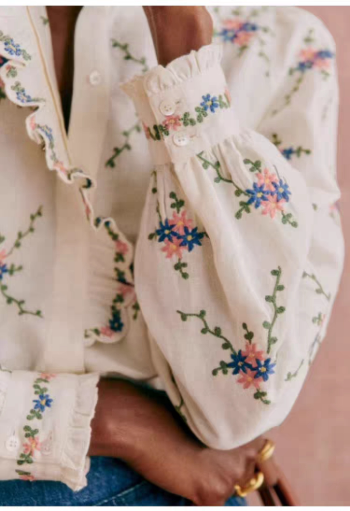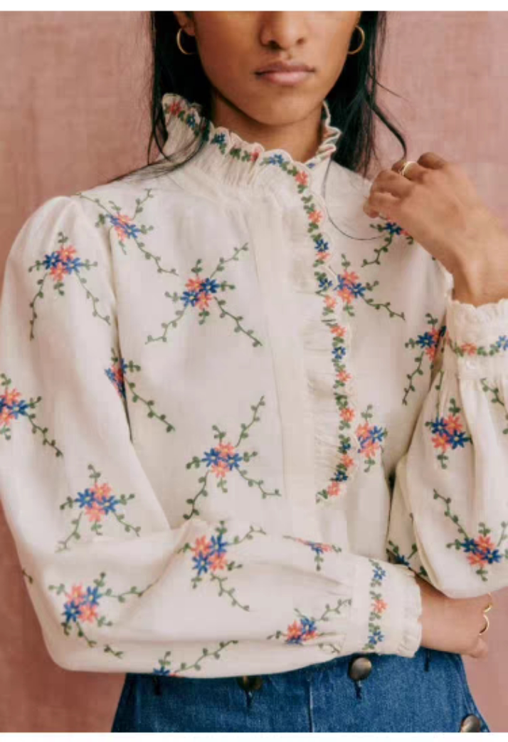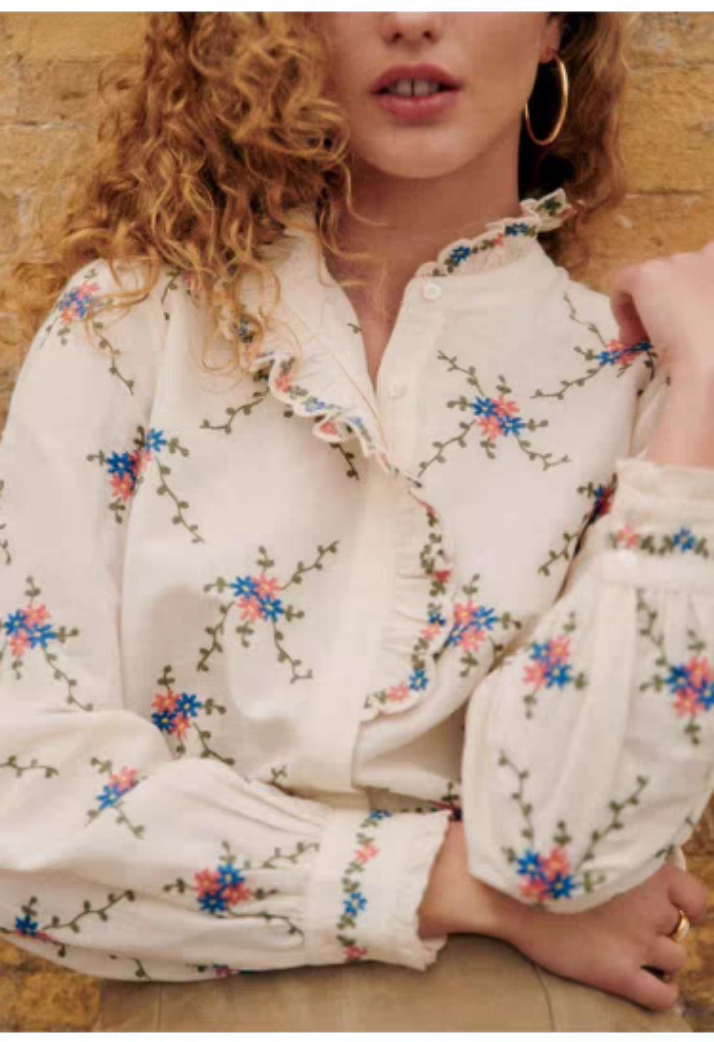 Sezane Women's Loose Long Sleeve Floral Shirt with Asymmetrical Lace Embroidery