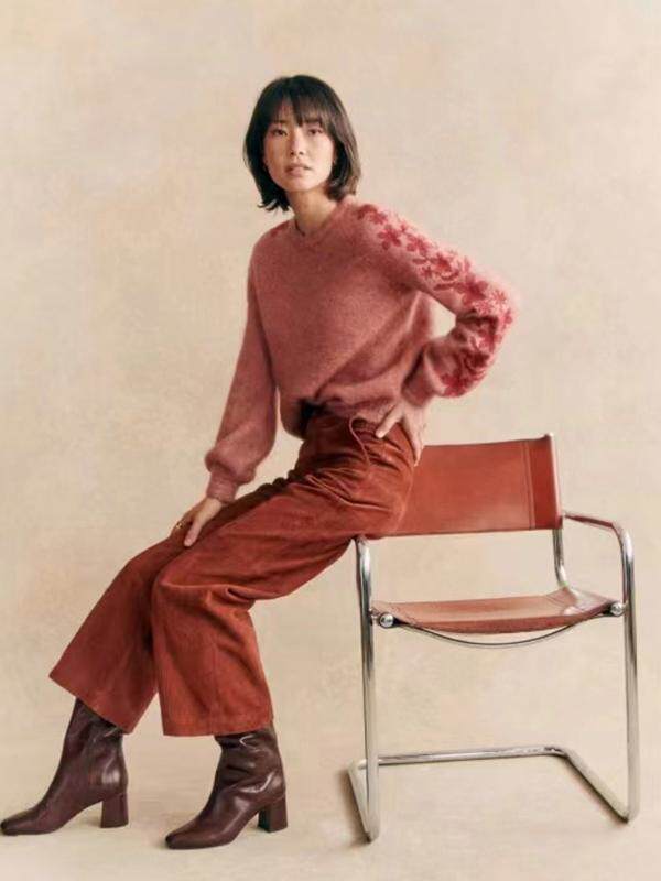 Sezane Women's Floral Embroidered Puffed Sleeve Crew Neck Pullover Sweater