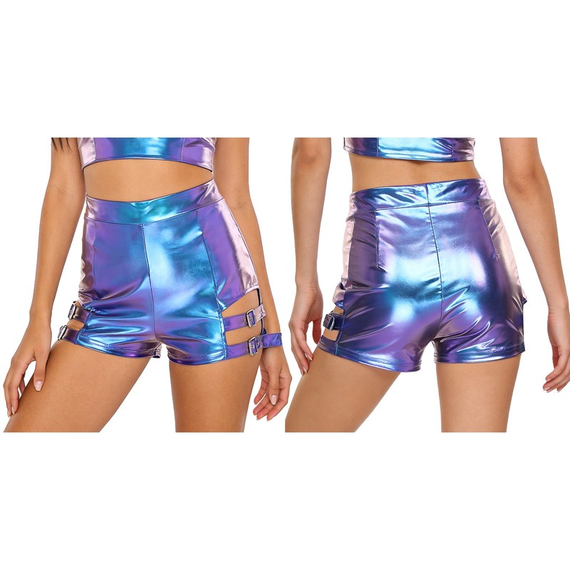 The thigh cutout with metal buckles is a bold and edgy detail, bringing a trendy and fashionable look to these shorts.