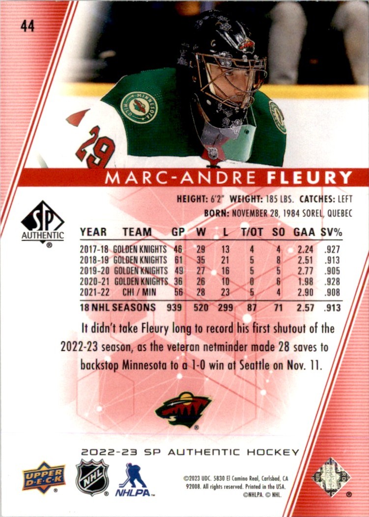 | Marc-Andre Fleury 2022-23 SP Authentic Limited Red #44 Minnesota Wild |