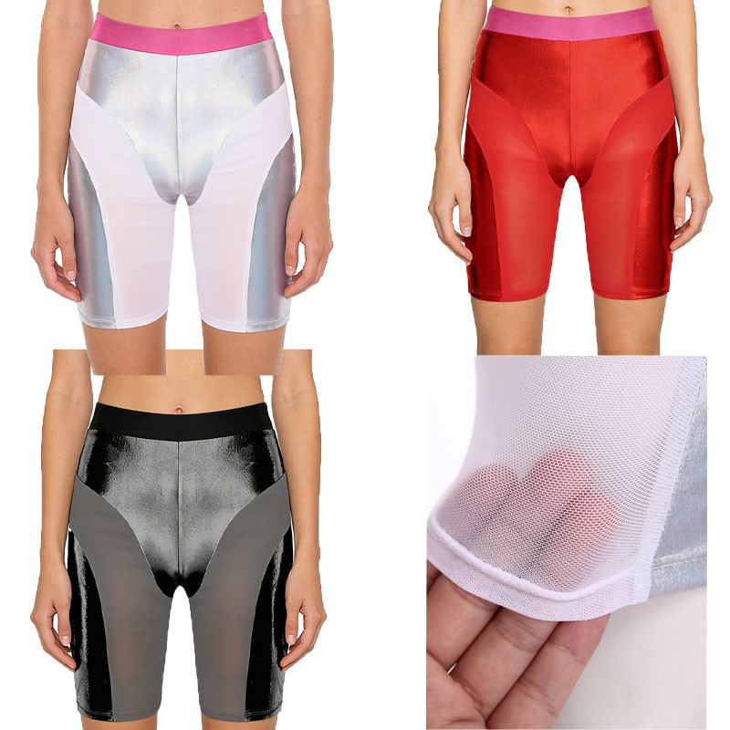 The see-through mesh patchwork and color-blocking design add a unique and fashionable touch, enhancing the overall style and making the shorts more appealing.