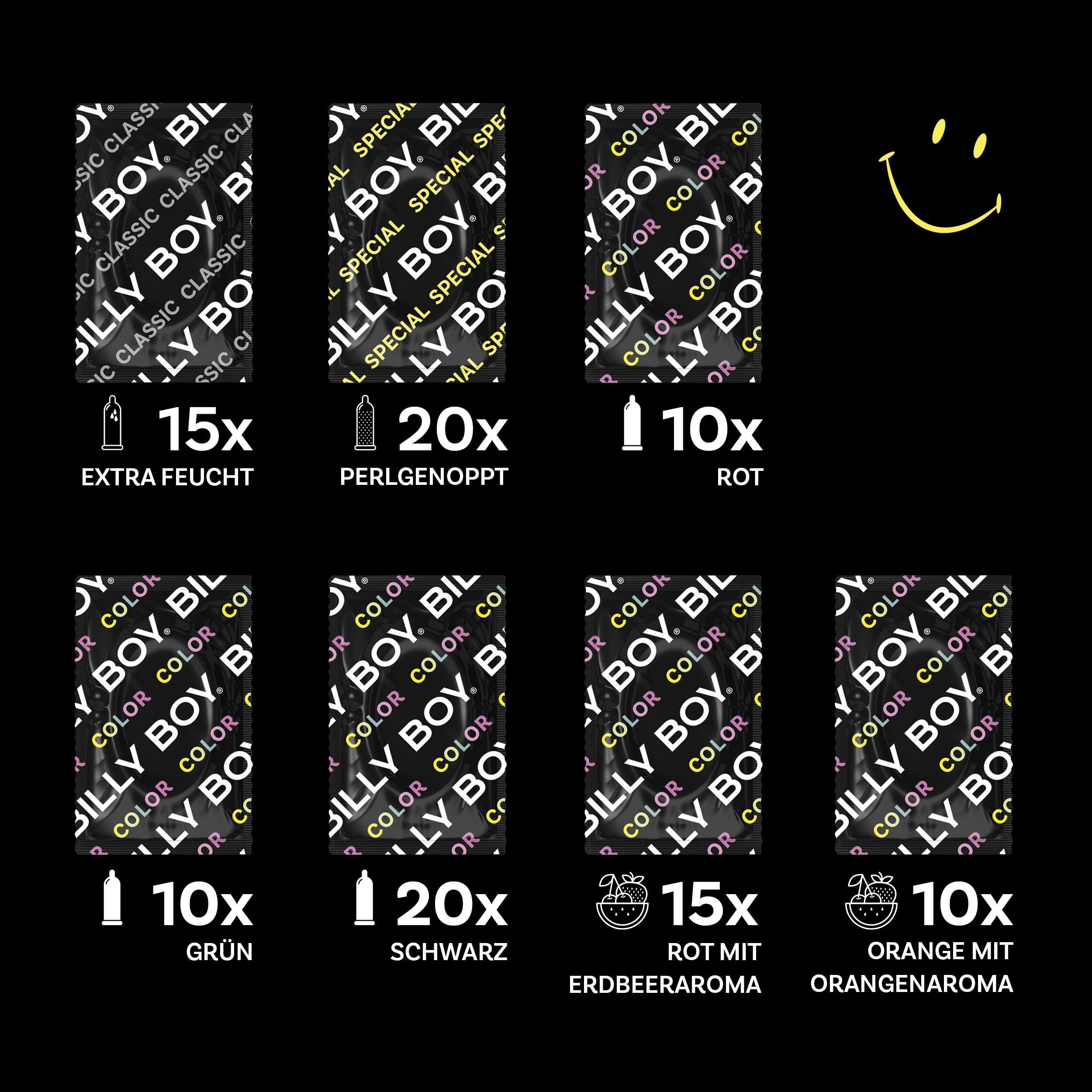 Billy Boy Mix-Sortiment - Kondome für mehr Spaß. Der Mix macht´s. Mehr Spaß durch farbige, fruchtige, extra feuchte und perlgenoppte Kondome. Billy Boy ist eine Qualitätsmarke - langjährige Herstellerkompetenz kombiniert mit hoher Produktqualität. Alle Billy Boy Kondome aus Naturkautschuklatex sind Made in Germany und einzeln elektronisch geprüft. Billy Boy bietet alles, was anmacht und unterstützt das Liebesspiel aufregend anders.