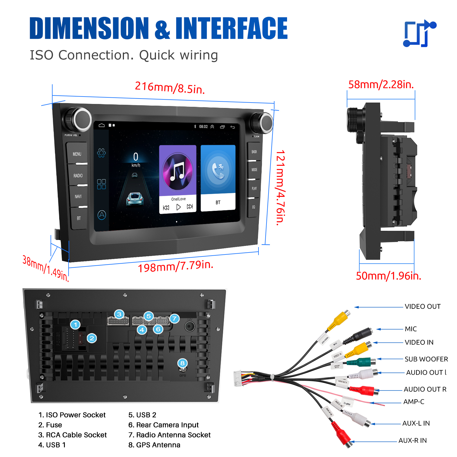 RDS/FM Radio and Bluetooth and ASP Sound: Supports Bluetooth 4.0, with built-in microphone so you can make hands-free calls while driving. Support access to phone book, music playback interface, etc. RDS supported. You can save 18 FM radio stations. Built-in ASP chip. Supports 16-band EQ setting, which can be adjusted according to your personal preference. Which is very similar to your original sound. 4 x 45W amplifier, surround sound and subwoofer output